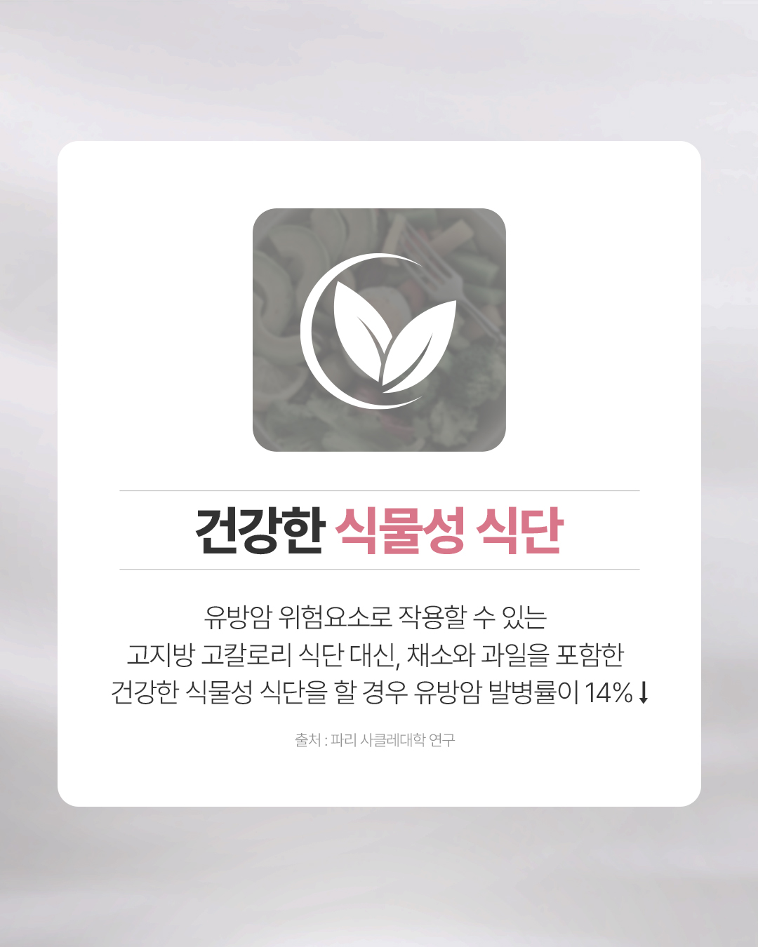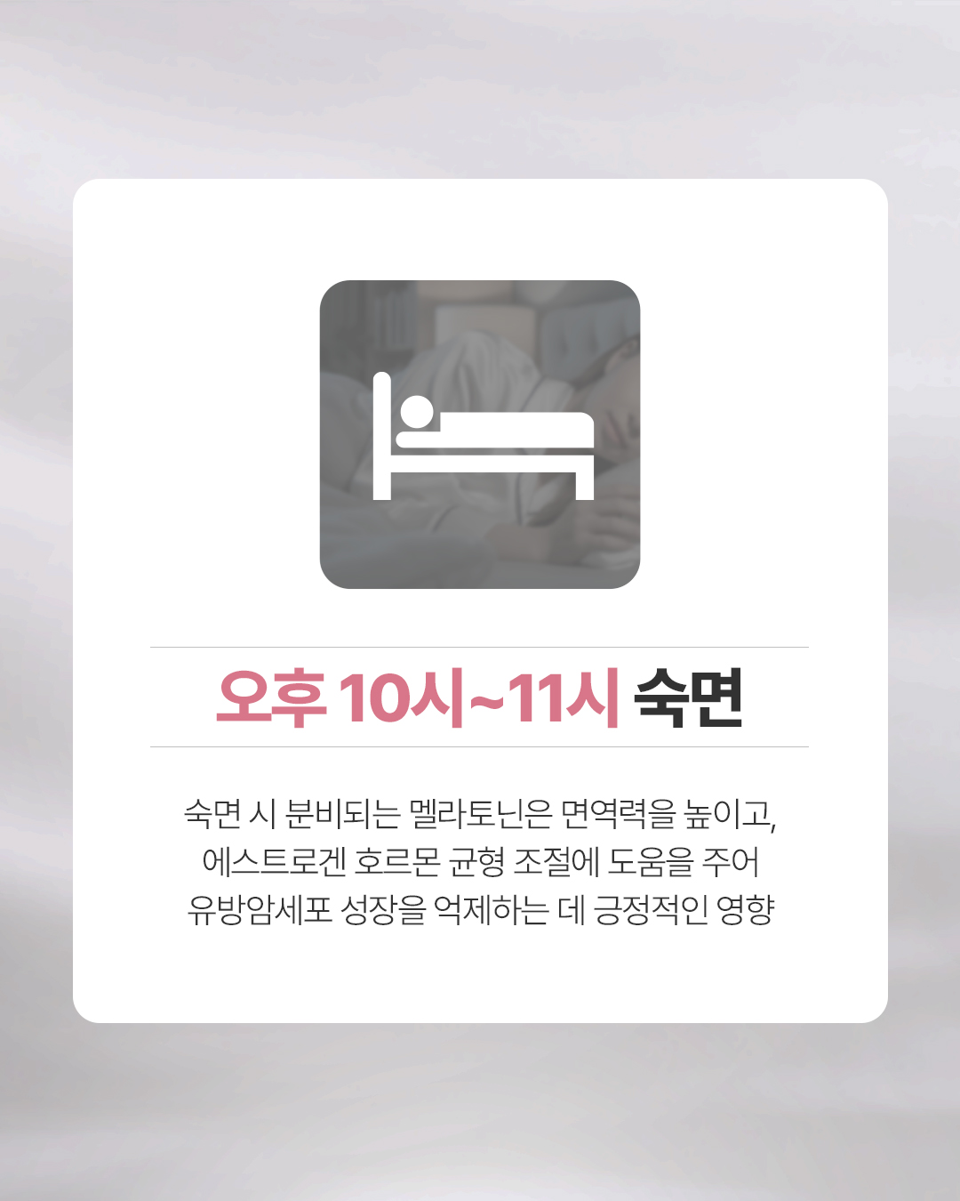 Q. 유방암을 예방하기 위해서 어떤 것들을 지켜야 할까요? 유방암 '이것'만 지켜도 예방할 수 있는데요. 아래의 사항만 지켜도 유방암 예방할 수 있습니다. (1) 오후 10시~11시 숙면: 숙면 시 분비되는 멜라토닌은 면역력을 높이고, 에스크로겐 호르몬 균형 조절에 도움을 주어 유방암세포 성장을 억제하는 데 긍정적인 영향을 미칩니다. (2) 밤에는 인공조명 최소화: 멜라토닌은 빛에 민감해 작은 불빛에도 분비량이 억제되며, 백색계열 조명은 멜라토닌 분비를 억제하는 파장이 많으므로 주의가 필요합니다. (3) 건강한 식물성 식단: 유방암 위험요소르 작용할 수 있는 고지방 고칼로리 식단 대신, 채소와 과일을 포함한 건강한 식물성 식단을 할 경우 유방암 발병률이 14% 감소되는 것으로 확인되었습니다(파리 사클레대학 연구). (4) 1~2년에 한번 정기검진: 국내 여성암 발생률 1위인 유방암은 초기 대부분이 아무런 증상이 없어, 정기검진을 통해 유방암 예방 및 조기발견을 하는 것이 중요합니다. ![]() ![]() ![]() ![]() ![]() ![]() ![]() |