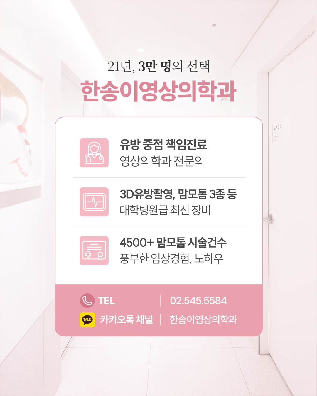 Q. 유방 양성종양 추적관찰 vs 조직검사 어떻게 해야 할까요? 대부분 유방 양성종양은 6개월~1년 간격으로 추적관찰이 권장되지만, 고위험 소견이 보일 경우 조직검사가 필요합니다. (1) 추적관찰이 권장되는 양성종양 - 경계가 뚜렷한 종양 - 크기, 모양 등 변화가 없는 양성종양 - 단순 섬유선종, 섬유낭종성 변화 (2) 조직검사가 필요한 양성종양 - 경계가 불분명한 종양 - 비정형적 모양의 종양 - 유방암 진행 가능성이 있는 종양 (관내 유두종, 엽상종양 등) 중요한 것은 정확한 판단입니다. 유방 영상검사에서 종양이 보이는 경우 모양, 경계 등을 종합적으로 고려하여 판단하는 만큼, 풍부한 임상경험을 가진 의료진의 정확한 판단이 중요합니다. ![]() ![]() ![]() ![]() ![]() ![]() |