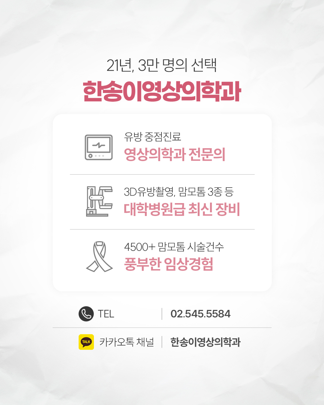 Q. 유방촬영술과 초음파 왜 함께 받아야 할까요? 국내 여성암 1위인 초기 유방암은 증상이 거의 없으며, 증상이 느껴졌을 때는 이미 발전, 전이됐을 확률이 높아 '초기 발견'을 위해 두 검사를 병행하는 것이 좋습니다. (1) 상호보완적 검사 유방촬영술과 초음파는 아래와 같이 강점이 다른 상호보완적 검사이기 때문에 함께 받는 것이 좋습니다. - 유방촬영술: X선을 이용해 유방을 촬영하는 방식으로, 미세석회화(0기 유방암 징후)를 발견할 수 있습니다. - 초음파: 고주파 음파를 이용한 실시간 검사로, 침윤성 암, 1cm 미만 종양을 발견할 수 있습니다. (2) 거짓 음성을 줄이는 병행 검사 위음성도(거짓음성)가 유방촬영술만 검사하면 20%, 유방초음파만 검사하면 18%지만, 두 가지 검사를 함께 시행했을 경우 3%로 낮아집니다. 따라서, 두 가지 검사를 진행할 경우, 아주 작은 유방암까지 찾아낼 수 있습니다. ![]() ![]() ![]() ![]() ![]() |