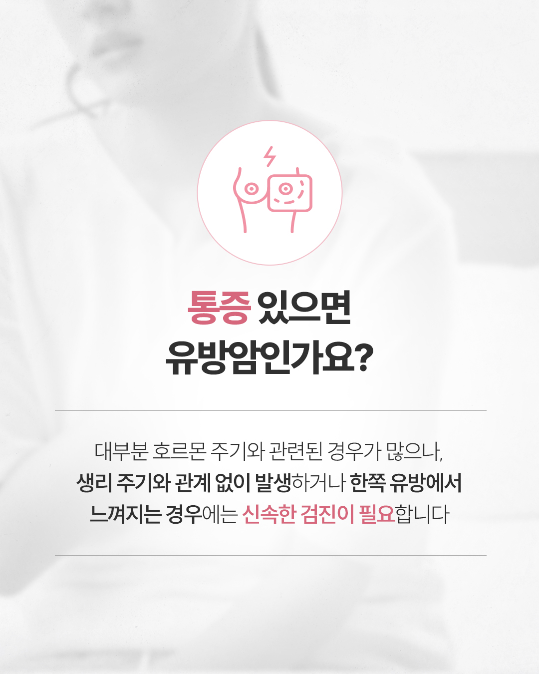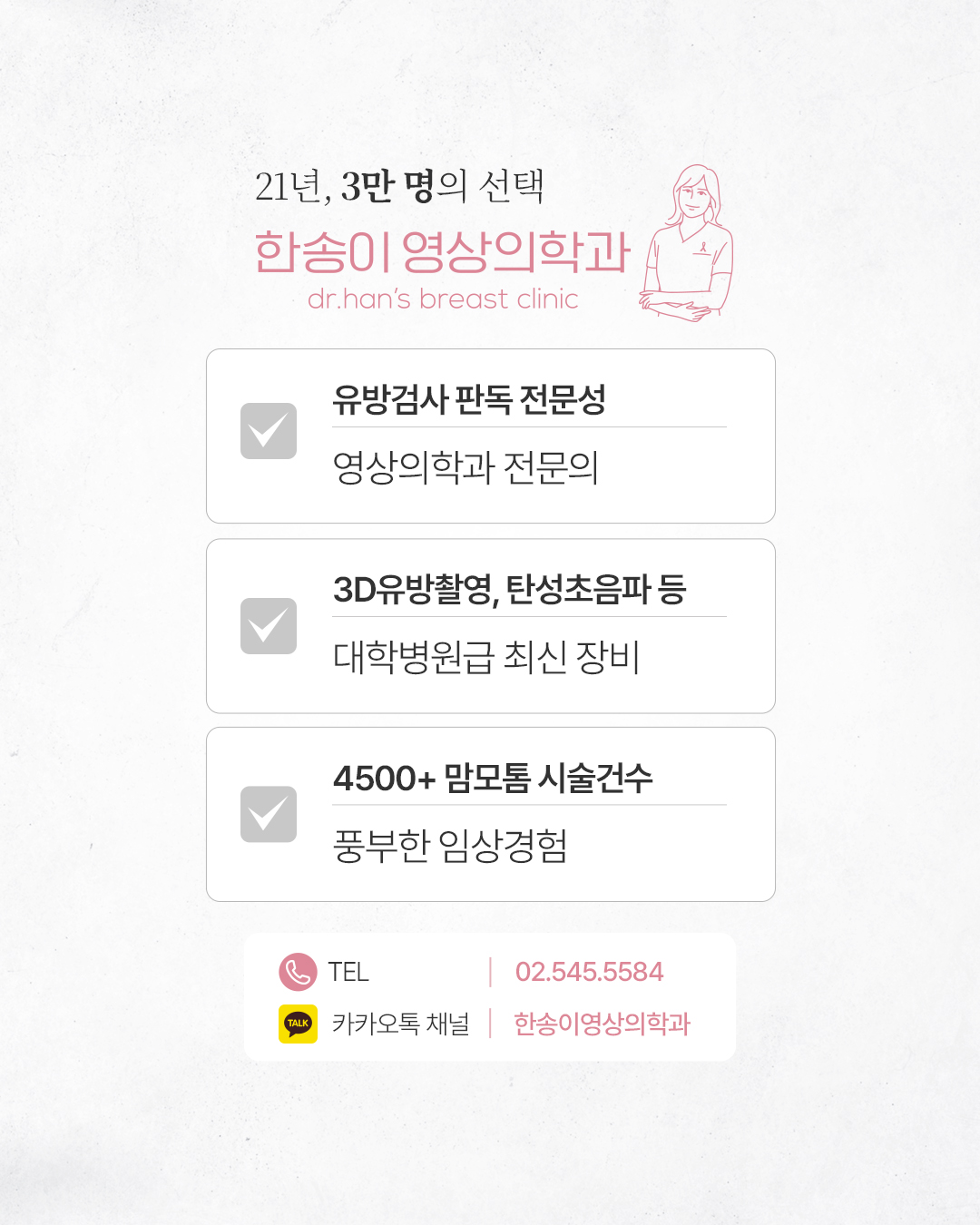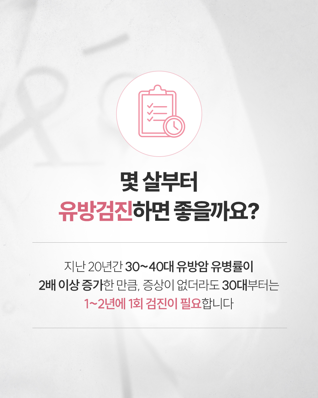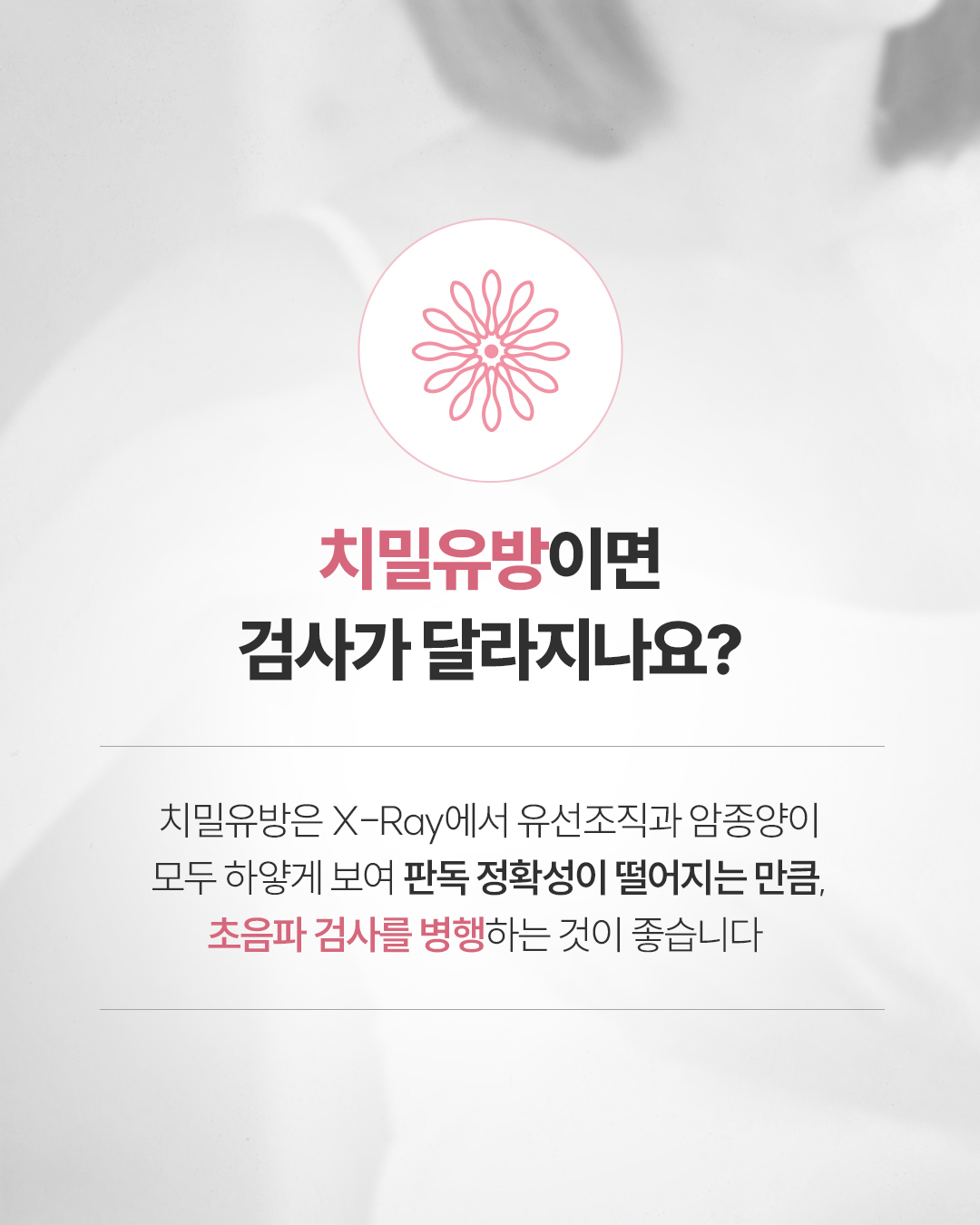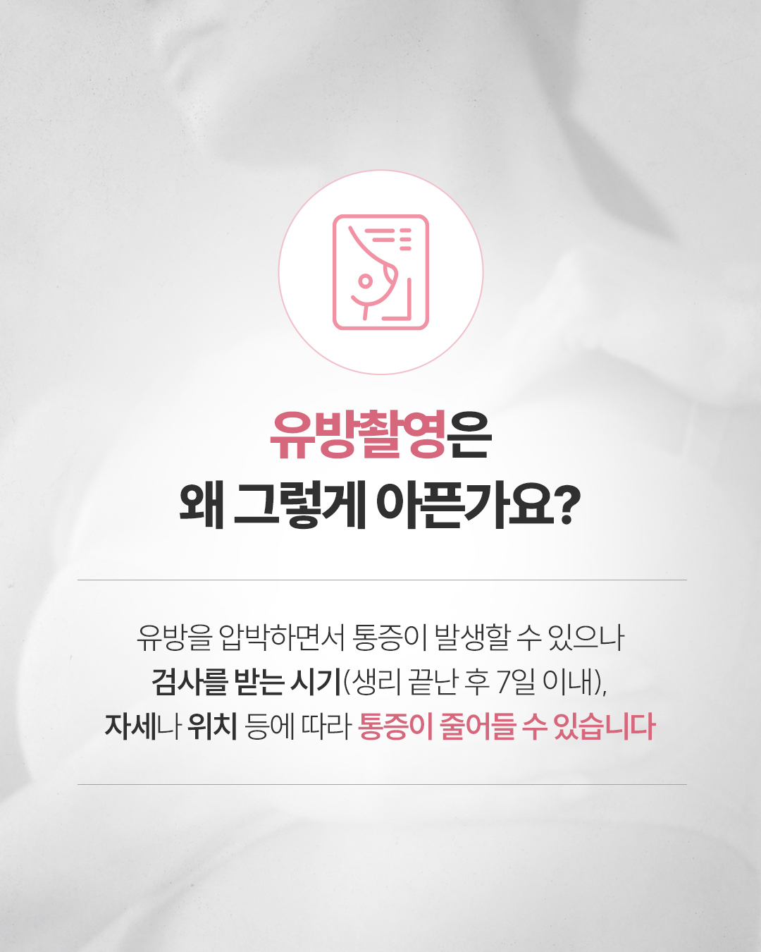Q. 몇 살부터 유방검진하면 좋을까요? 지난 20년간 30~40대 유방암 유병률이 2배 이상 증가한 만큼, 증상이 없더라도 30대부터는 1~2년에 1회 검진이 필요합니다. Q. 유방촬영은 왜 그렇게 아픈가요? 유방을 압박하면서 통증이 발생할 수 있으나 검사를 받는 시기(생리 끝난 후 7일 이내), 자세나 위치 등에 따라 통증이 줄어들 수 있습니다. Q. 통증 있으면 유방암인가요? 대부분 호르몬 주기와 관련된 경우가 많으나, 생리 주기와 관계없이 발생하거나 한쪽 유방에서 느껴지는 경우에는 신속한 검진이 필요합니다. Q. 치밀유방이면 검사가 달라지나요? 치밀유방은 X-ray에서 유선조직과 암종양이 모두 하얗게 보여 판독 정확성이 떨어디는 만큼, 초음파 검사를 병행하는 것이 좋습니다. ![]() ![]() ![]() ![]() ![]() ![]() ![]() |