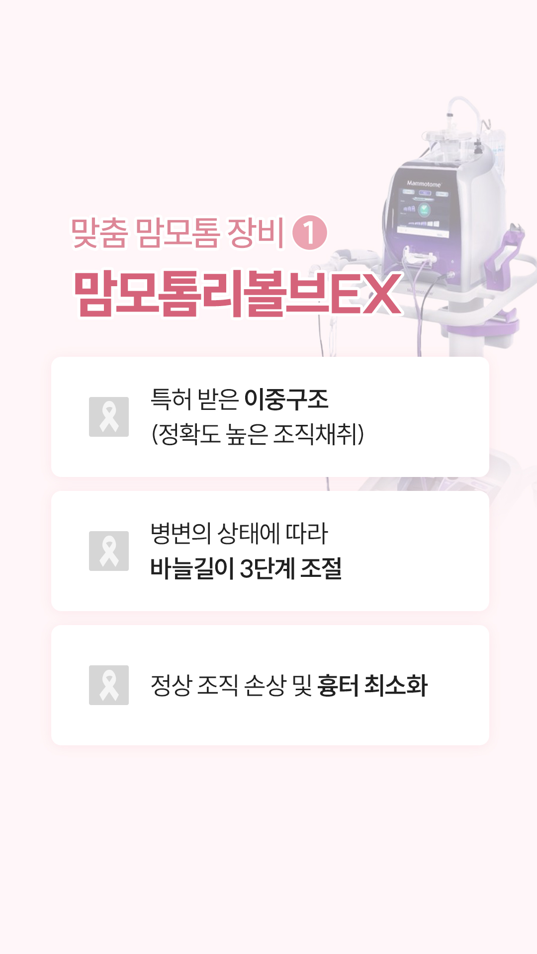 Q. 맘모톰 병원 선택할 때 어떤 것들을 확인하면 좋을까요? (1) 맞춤형 맘모톰 장비가 있는지 확인 유방 조직 밀도, 병변 상태 등에 따라 적합한 맘모톰 장비를 선택할 수 있도록 다양한 맘모톰 장비를 보유하고 있는지 확인하세요. 1) 맘모톰리볼브EX (맞춤 맘모톰 장비1) - 특허 받은 이중구조 (정확도 높은 조직채취) - 병변의 상태에 따라 바늘길이 3단계 조절 - 정상 조직 손상 및 흉터 최소화 2) 엔코엔스파이어 (맞춤 맘모톰 장비2) - 3면의 다각도 칼날 디자인 (치밀유방 적합) - 표적 정확도 및 병변 제거율 향상 - 큰 종양, 다발성 종양 제거에 유용 3) 벡스코어 (맞춤 맘모톰 장비3) - 국내 유방암 전문의가 직접 개발 - 병변 크기, 위치 등에 따라 바늘 굵기 맞춤 적용 - 크고 단단한 종양을 빠르고 안전하게 제거 (2) 유방특화+영상판독 전문성 복잡한 유방 구조를 실시간 초음파로 확인하며 정밀하게 접근해야 정상 조직 손상을 최소화하며, 보다 안전하고 세심한 맘모톰 시술이 가능합니다. ![]() ![]() ![]() ![]() ![]() ![]() ![]() |