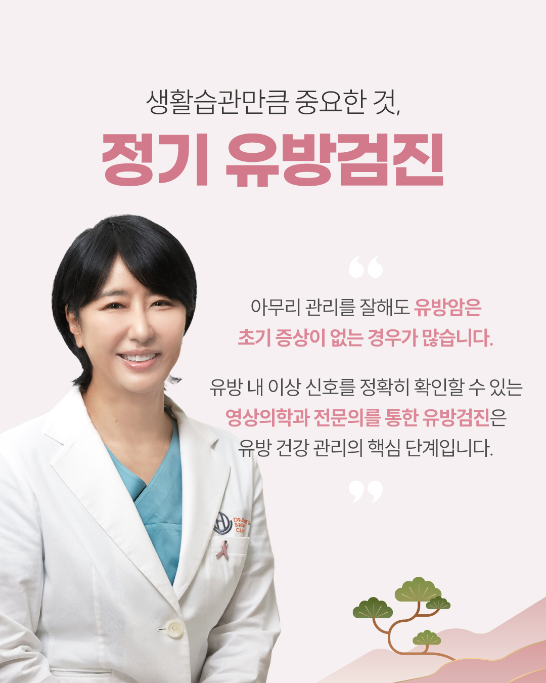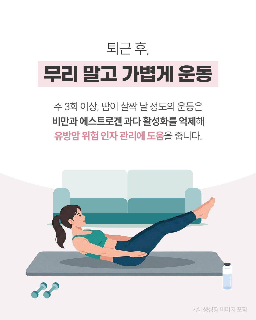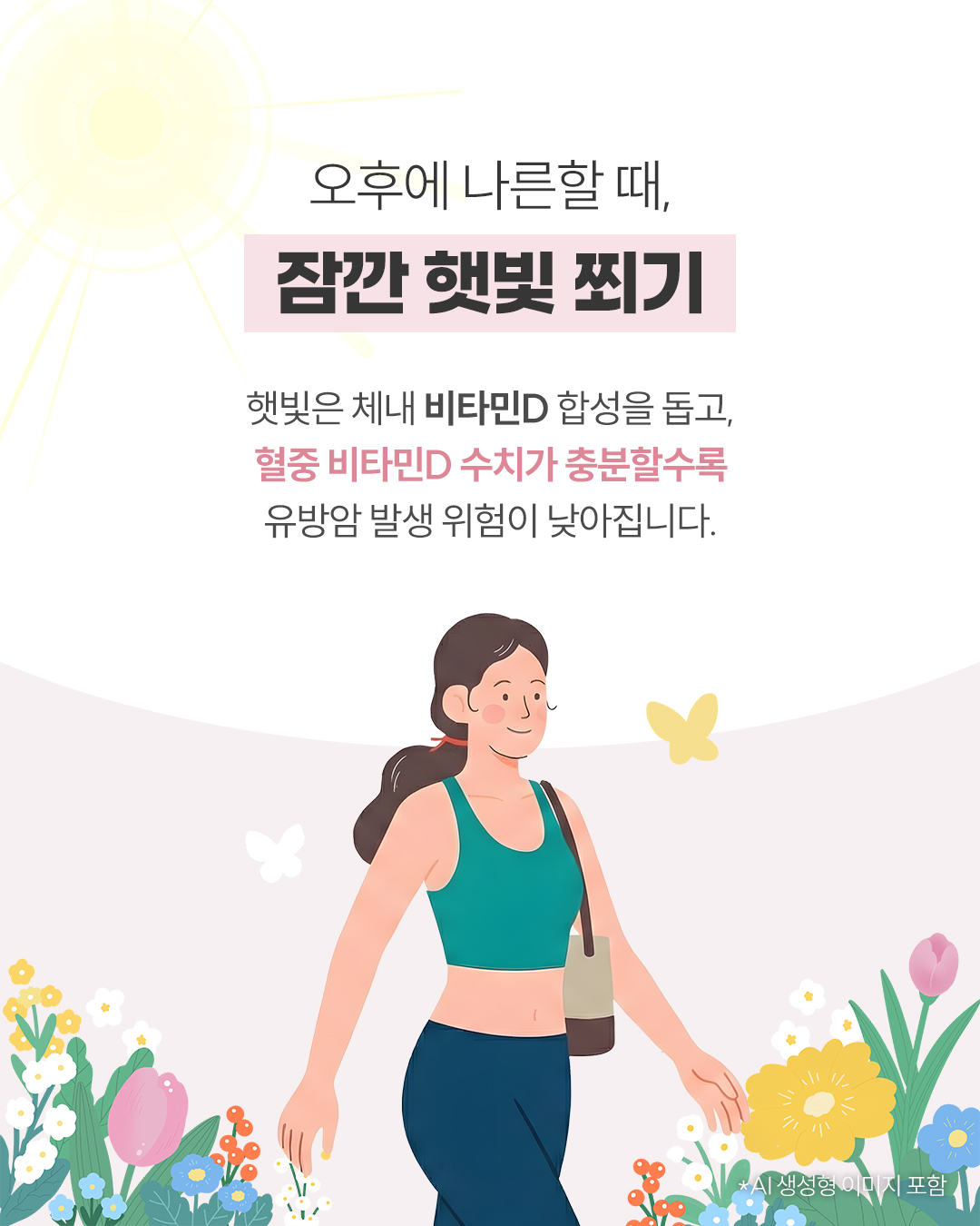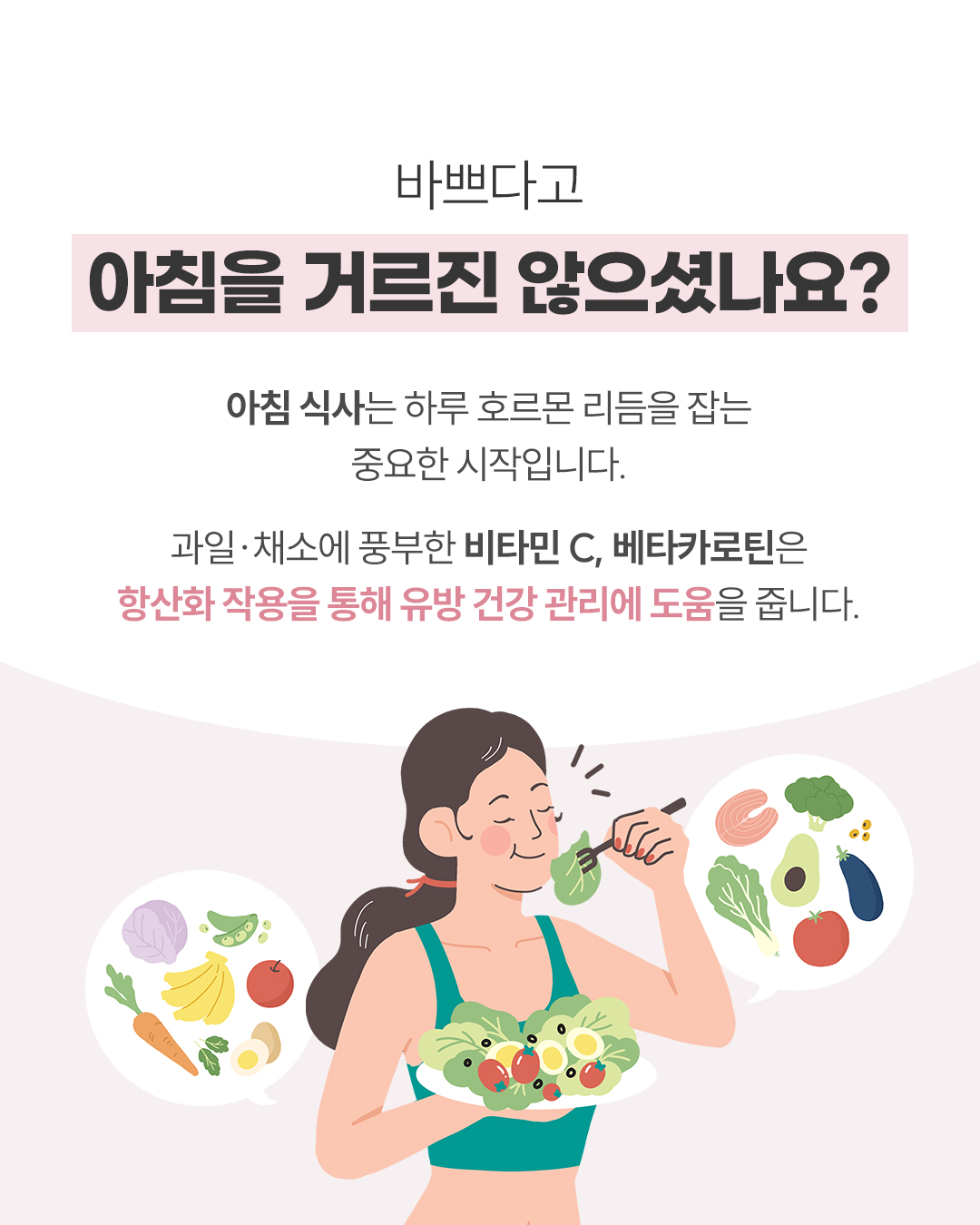 Q. 유방암을 예방하기 위한 좋은 생활습관? (1) 아침식사 바쁘다고 아침을 거르진 않으셨나요? 아침식사는 하루 호르몬 리듬을 잡는 중요한 시작입니다. 과일, 채소에 풍부한 비타민C, 베타카로틴은 항산화 작용을 통해 유방 건강 관리에 도움을 줍니다. (2) 오후에 나른할 때, 잠깐 햇빛 쬐기 햇빛은 체내 비타민D 합성을 돕고, 혈중 비타민D 수치가 충분할수록 유방암 발생 위험이 낮아집니다. (3) 퇴근 후, 무리 말고 가볍게 운동 주 3회 이상, 땀이 살짝 날 정도의 운동은 비만과 에스트로겐 과다 활성화를 억제해 유방암 위험 인자 관리에 도움을 줍니다. (4) 주말은 즐겁게, 하지만 과음은 금물 알코올은 체내에 쌓일 경우 에스트로겐 활성 증가와 암 유발 유전자 발현 가능성을 높입니다. ![]() ![]() ![]() ![]() ![]() ![]() ![]() |
