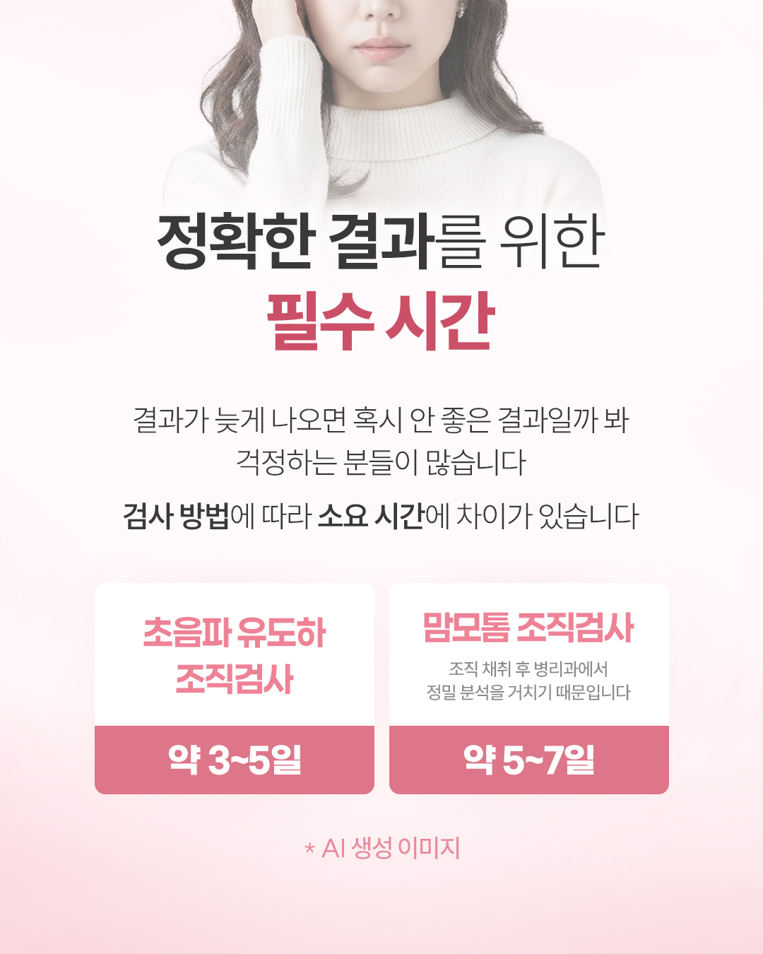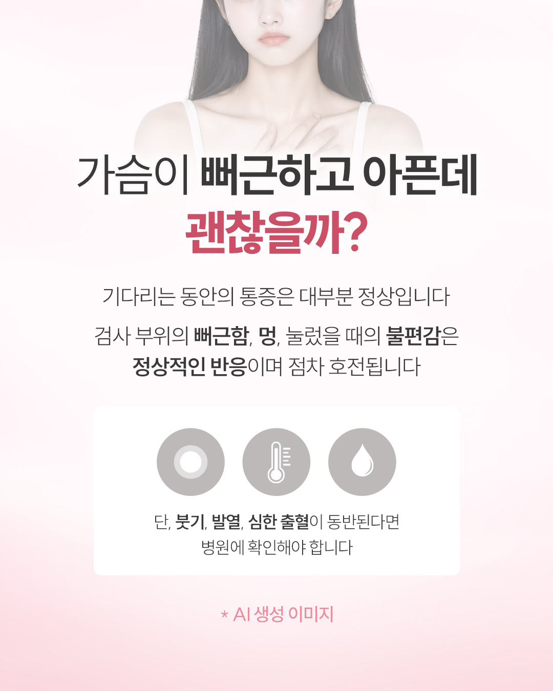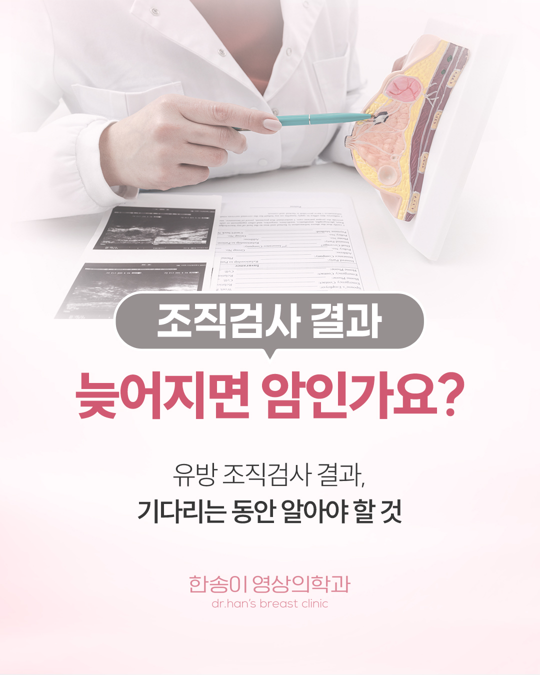 Q. 조직검사 결과 늦어지면 암인가요? 결과가 늦게 나오면 혹시 안 좋은 결과일까봐 걱정하는 분들이 많습니다. 하지만 검사 방법과 소요 시간에 차이가 있습니다. - 초음파 유도하 조직검사: 3~5일 - 맘모톰 조직검사: 5~7일 (조직 채취 후 병리과에서 정밀 분석을 거치기 때문입니다) 결과가 지연된다고 위험하다는 건 아닙니다. 결과가 늦어지는 가장 흔한 이유는 다음과 같습니다. (1) 추가 염색 검사가 필요한 경우 (2) 병변 구조가 복잡해 분석 시간이 더 필요한 경우 (3) 여러 조각의 조직을 함께 판독하는 경우 정확도를 높이기 위한 과정일 뿐 나쁜 결과를 의미하지 않습니다. Q. 가슴이 뻐근하고 아픈데 괜찮을까요? 기다리는 동안의 통증은 대부분 정상입니다. 검사 부위의 뻐근함, 멍, 눌렀을 때의 불편감은 정상적인 반응이며 점차 호전됩니다. 단, 붓기, 발열, 심한 출혈이 동반된다면 병원에 확인해야 합니다. Q. 결과지 문구에 '비정형'이라고 나오면 암인가요? '비정형'이라고 해서 암은 아닙니다. 결과지에 적힌 '비정형 세포', '경계성 병변'은 당장 암이라는 뜻이 아니가, 추가 검사나 추적 관찰이 필요한 상태를 뜻하는 경우가 많습니다. Q. 인터넷 검색을 멈춰야 하는 이유는? 개인의 병변 위치와 조직 양상에 따라 결과의 의미는 완전히 다릅니다. 인터넷 검색으로 최악의 상황을 가정하는 것은 불안만 키울 뿐입니다. 정확한 해석은 반드리 의료진의 설명과 함께 해야 합니다. ![]() ![]() ![]() ![]() ![]() ![]() ![]() |