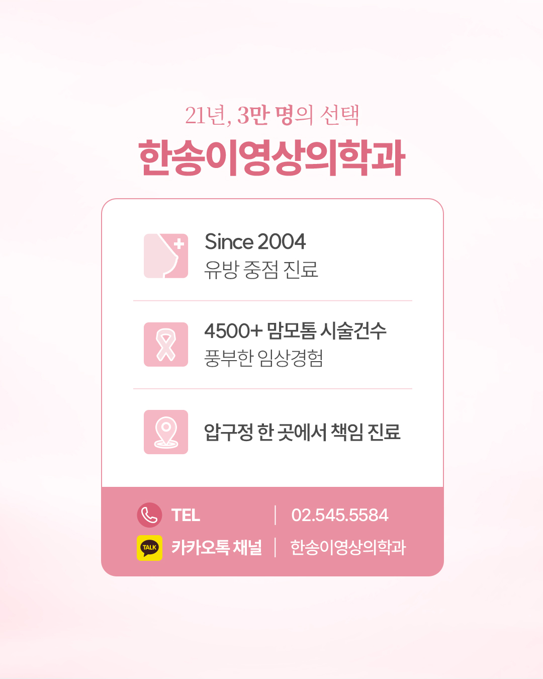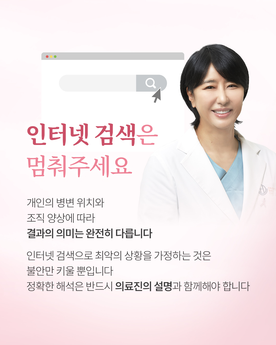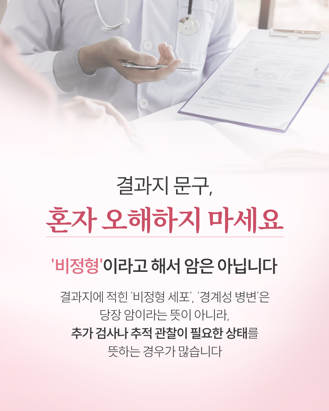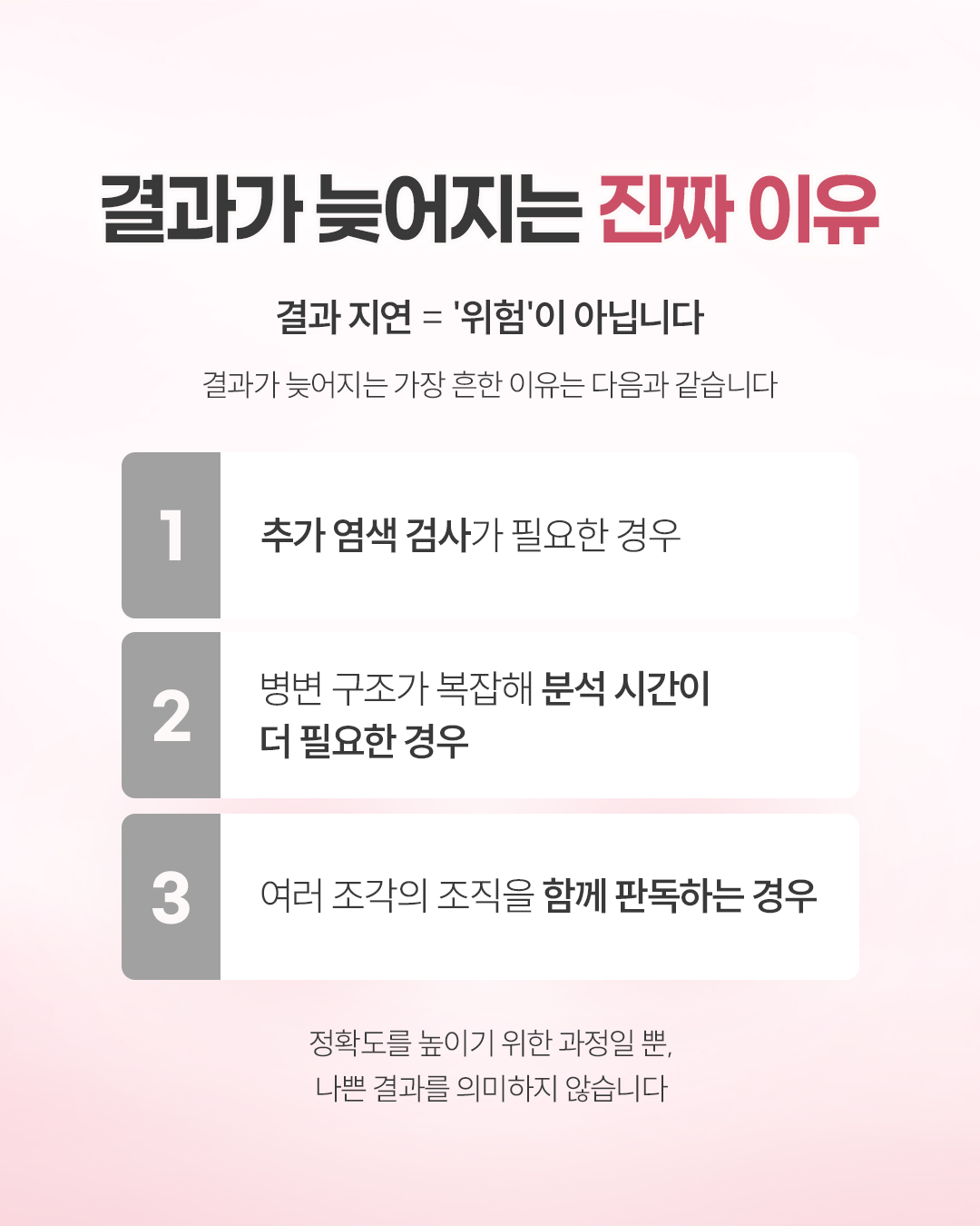 Q. 조직검사 결과 늦어지면 암인가요? 결과가 늦게 나오면 혹시 안 좋은 결과일까봐 걱정하는 분들이 많습니다. 하지만 검사 방법과 소요 시간에 차이가 있습니다. - 초음파 유도하 조직검사: 3~5일 - 맘모톰 조직검사: 5~7일 (조직 채취 후 병리과에서 정밀 분석을 거치기 때문입니다) 결과가 지연된다고 위험하다는 건 아닙니다. 결과가 늦어지는 가장 흔한 이유는 다음과 같습니다. (1) 추가 염색 검사가 필요한 경우 (2) 병변 구조가 복잡해 분석 시간이 더 필요한 경우 (3) 여러 조각의 조직을 함께 판독하는 경우 정확도를 높이기 위한 과정일 뿐 나쁜 결과를 의미하지 않습니다. Q. 가슴이 뻐근하고 아픈데 괜찮을까요? 기다리는 동안의 통증은 대부분 정상입니다. 검사 부위의 뻐근함, 멍, 눌렀을 때의 불편감은 정상적인 반응이며 점차 호전됩니다. 단, 붓기, 발열, 심한 출혈이 동반된다면 병원에 확인해야 합니다. Q. 결과지 문구에 '비정형'이라고 나오면 암인가요? '비정형'이라고 해서 암은 아닙니다. 결과지에 적힌 '비정형 세포', '경계성 병변'은 당장 암이라는 뜻이 아니가, 추가 검사나 추적 관찰이 필요한 상태를 뜻하는 경우가 많습니다. Q. 인터넷 검색을 멈춰야 하는 이유는? 개인의 병변 위치와 조직 양상에 따라 결과의 의미는 완전히 다릅니다. 인터넷 검색으로 최악의 상황을 가정하는 것은 불안만 키울 뿐입니다. 정확한 해석은 반드리 의료진의 설명과 함께 해야 합니다. ![]() ![]() ![]() ![]() ![]() ![]() ![]() |