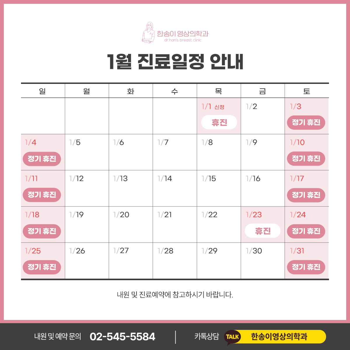 안녕하세요. 한송이영상의학과입니다. 본원의 1월 진료일정을 안내해 드립니다. ![]() <휴진> ◆ 1/1 (목) 휴진 ◆ 1/23(금) 휴진 ◆ 매주 토요일, 일요일 정기휴진입니다. 내원예약 및 문의에 참고 부탁드립니다. |
