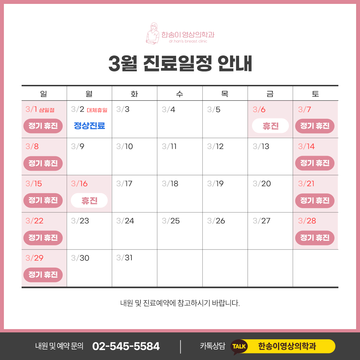 안녕하세요. 한송이영상의학과입니다. 본원의 3월 진료일정을 안내해 드립니다. ![]() <휴진> ◆ 3/6 (금) 휴진 ◆ 3/16 (월) 휴진 ◆ 매주 토요일, 일요일 정기휴진입니다. <정상진료> ◆ 3/2 (월) 진료 내원예약 및 문의에 참고 부탁드립니다.