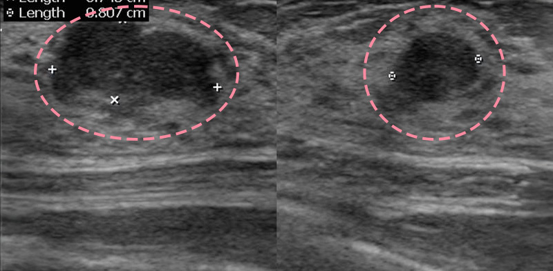 맘모톰시술 6개월 후 유방초음파 검사 시행 결과 종양이 깨끗하게 제거됨을 확인했으며, 약간의 반흔 조직이 남았으나 시간이 지나면서 대부분 사라지기 때문에 좋은 예후가 기대되었습니다.