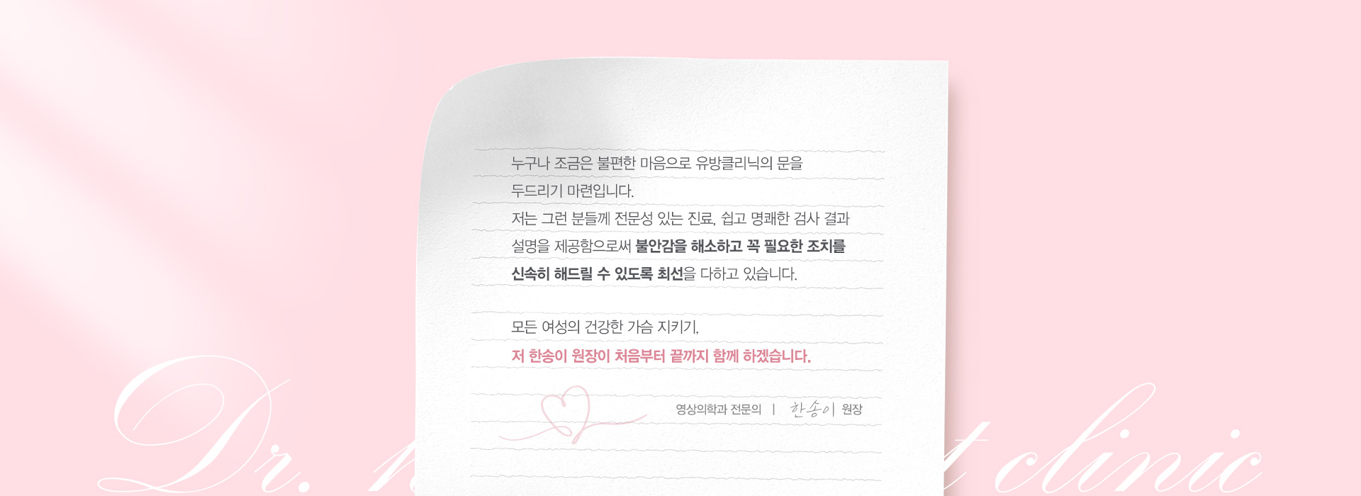 한쪽 유방 멍울이 평소와 너무 다르고 통증이 심해서 방문하였습니다. 여러 검진 모두 굉장히 꼼꼼히 봐 주셨고, MRI 전문 병원까지 소개해 주셔서 결과 확인 후 안심할 수 있었습니다.