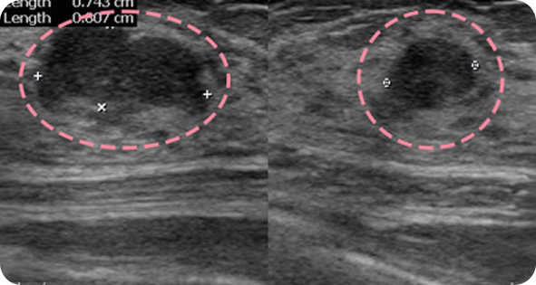 양성 종양은 여러 개가 동시에 생겨나기도 합니다. 정상적인 유방 조직 보전에 신경 쓰며 맘모톰 시술을 섬세히 진행했고, 6개월 뒤 추적 관찰을 위한 유방초음파에서 종양이 깨끗이 제거된 것을 확인 했습니다. 일부 반흔 조직은 자연스럽게 호전될 것으로 보여 좋은 예후가 기대되었습니다.