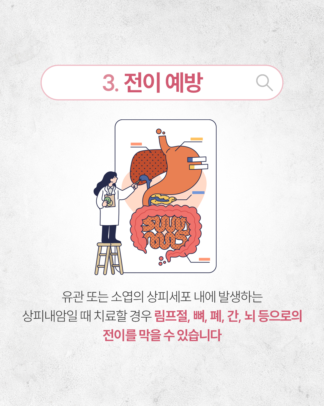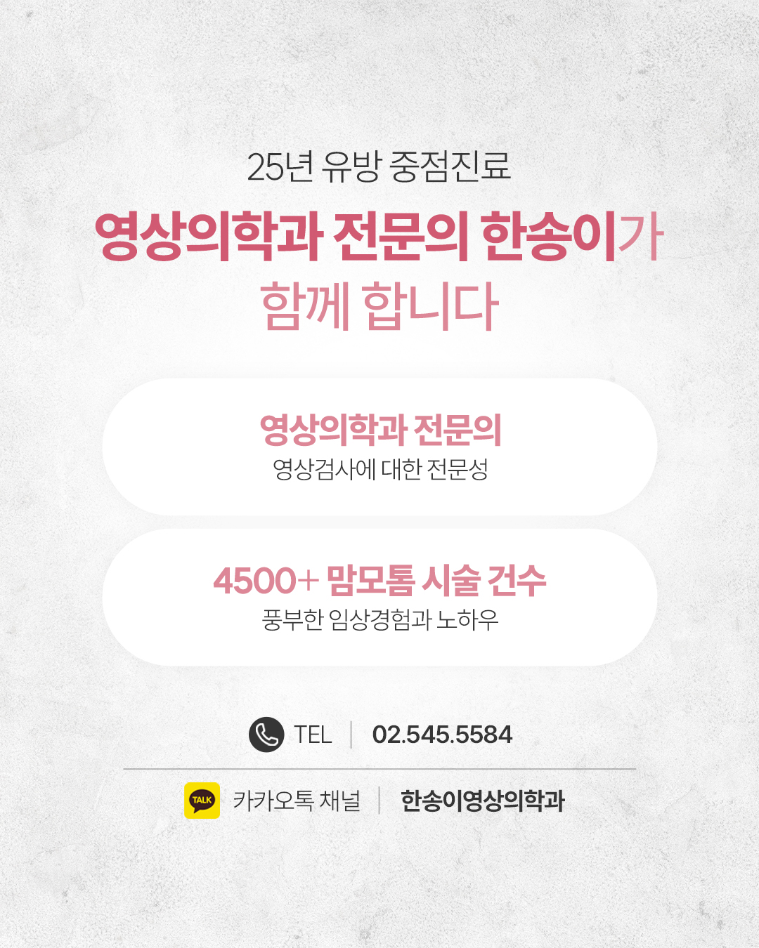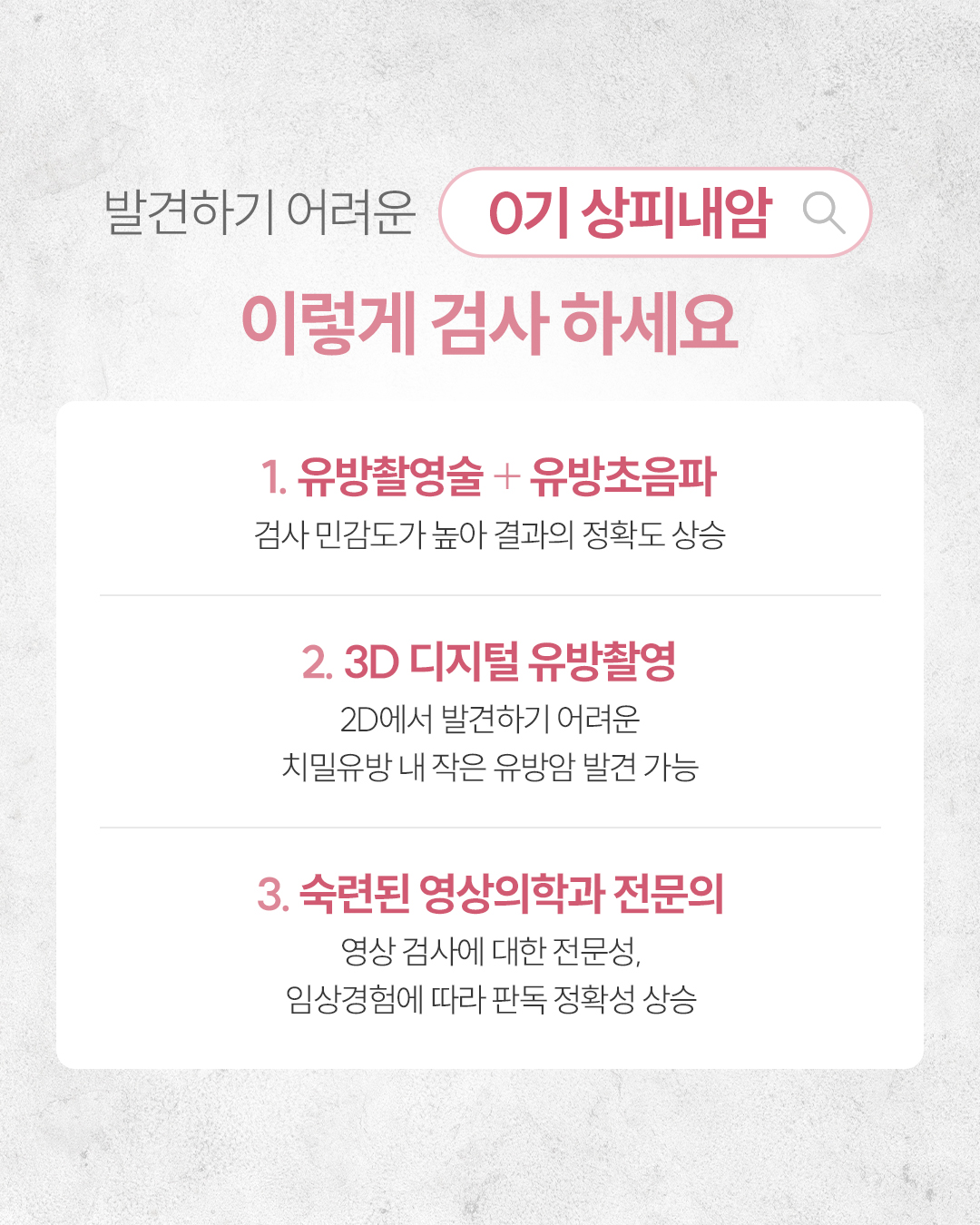Q. 유방암 0기 조기발견이 더욱 중요한 이유는? (1) 생존율의 차이: 유방암 0기 조기발견시 생존율 98% 이상으로 예후가 좋지만, 뒤늦게 발견할 경우 치료 성공률과 생존율이 떨어집니다. (2) 치료 부담 감소: 조기발견 시 항암과 전신마취 없이 간단하게 치료가 가능하지만, 뒤늦게 발견할 경우 치료범위 및 유방 절제 등 부담이 증가합니다. (3) 전이 예방: 유관 또는 소엽의 상피세포 내에 발생하는 상피내암일 때 치료할 경우 림프절, 뼈, 폐, 간, 뇌 등으로의 전이를 막을 수 있습니다. Q. 발견하기 어려운 0기 상피내암 어떻게 검사해야 할까요? (1) 유방촬영술+유방초음파: 검사 민감도가 높아 결과의 정확도 상승 (2) 3D 디지털 유방촬영: 2D에서 발견하기 어려운 치밀유방 내 유방암 발견 가능 (3) 숙련된 영상의학과 전문의: 영상 검사에 대한 전문성, 임상경험에 따라 판독 정확성 상승 ![]() ![]() ![]() ![]() ![]() ![]() |