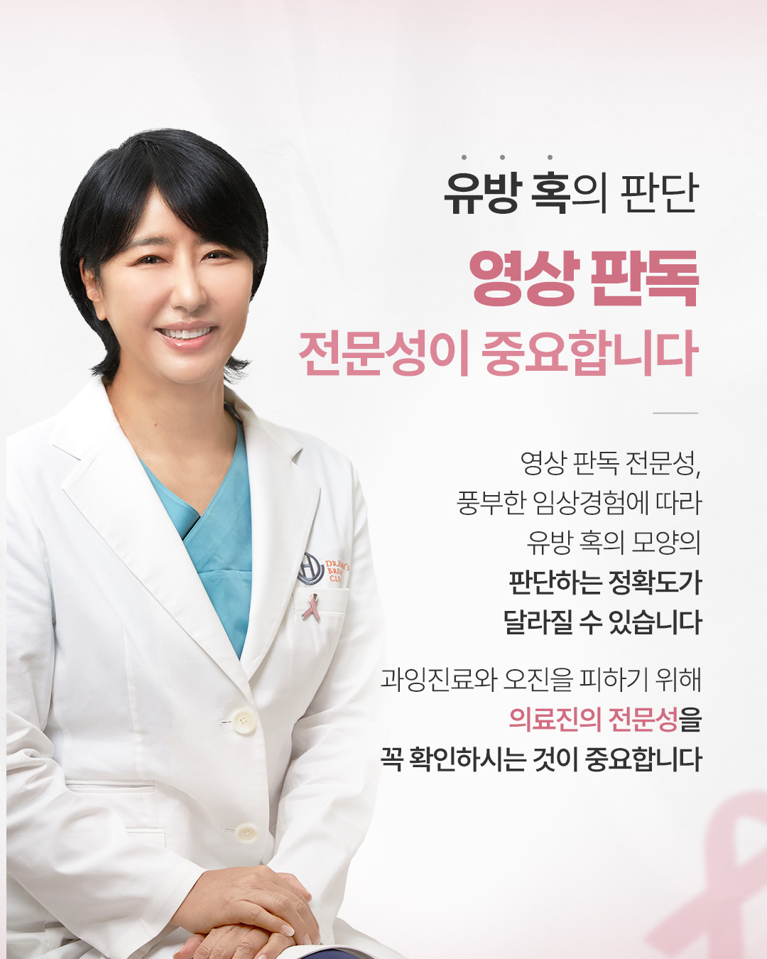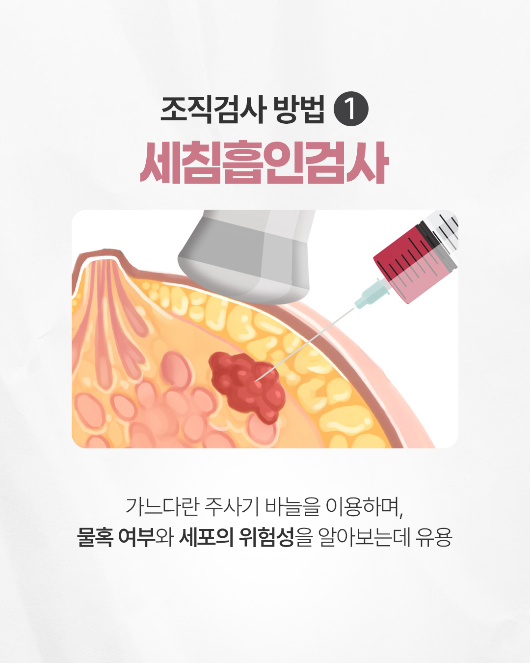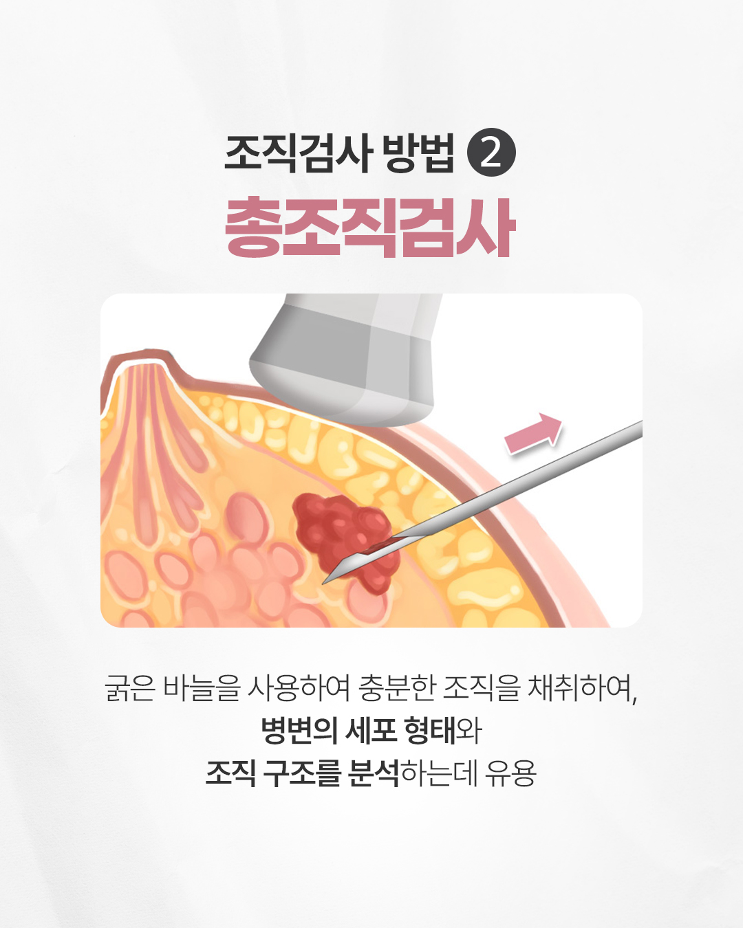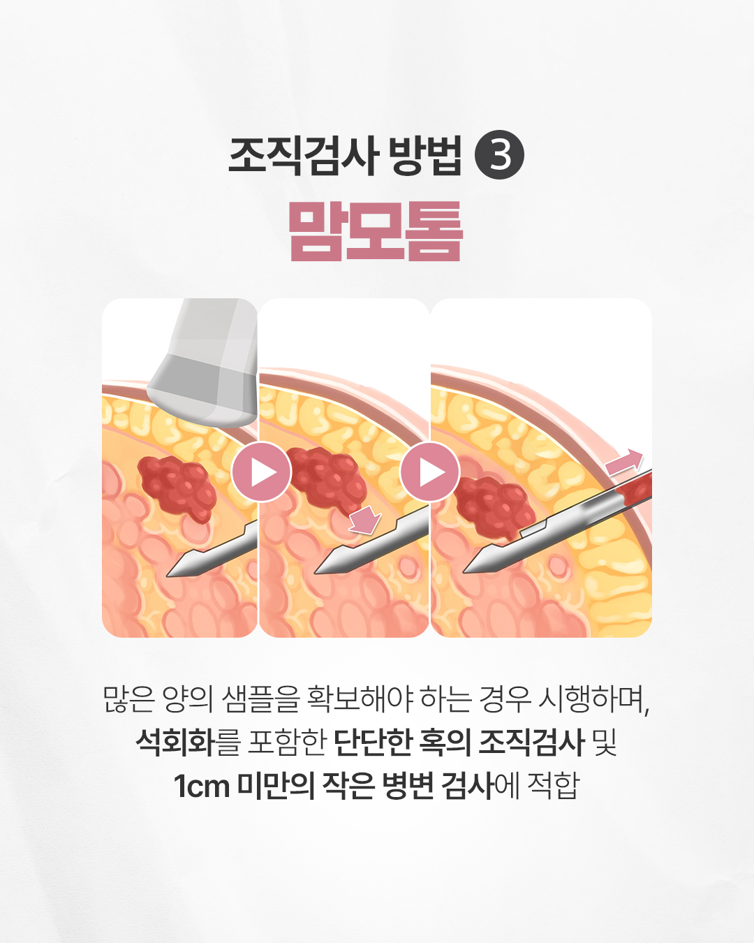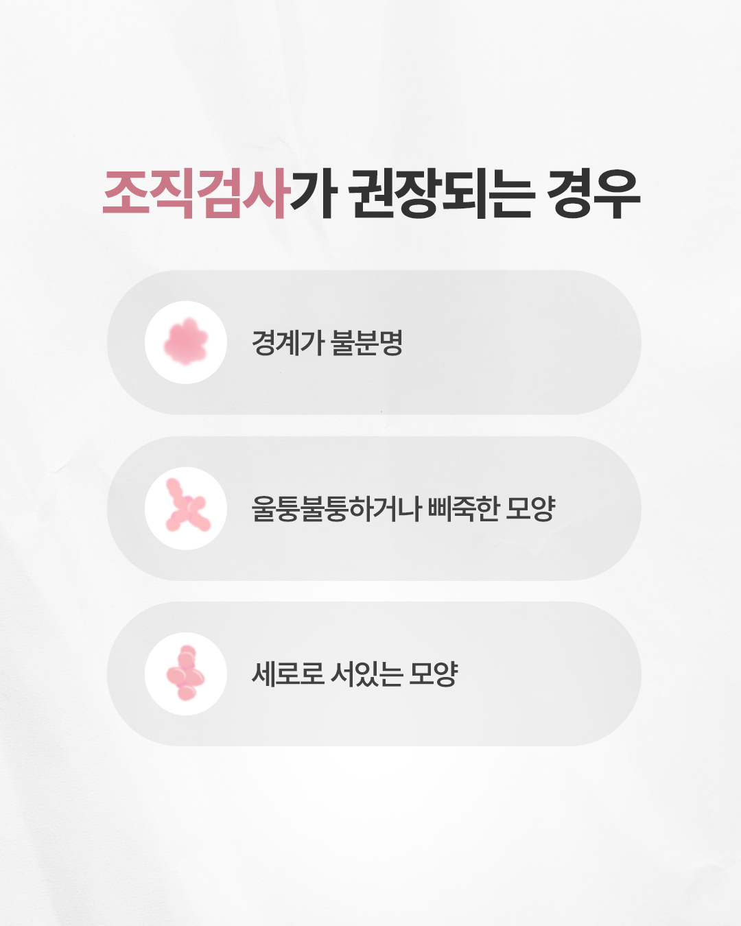 Q. 모양이 나쁜 유방 혹 어떻게 해야 할까요? 혹의 크기가 작다고 해도 모양이 비정형적일 경우 악성 종양일 가능성이 있어 조직검사가 필요합니다. 조직검사가 권장되는 경우는 아래와 같습니다. - 경계가 불분명 - 울퉁불퉁하거나 삐죽한 모양 - 세로로 서있는 모양 Q. 조직검사 방법에는 어떤 방법들이 있나요? 조직검사 방법에는 아래와 같은 방법들이 있습니다. (1) 세침흡인검사: 가느다란 주사기 바늘을 이용하며, 물혹 여부와 세포의 위험성을 알아보는데 유용합니다. (2) 총조직검사: 굵은 바늘을 사용하여 충분한 조직을 채취하여, 병변의 세포 형태와 조직 구조를 분석하는데 유용합니다. (3) 맘모톰: 많은 양의 샘플을 확보해야 하는 경우 시행하며, 석회화를 포함한 단단한 혹의 조직검사 및 1cm 미만의 작은 병변 검사에 적합합니다. Q. 유방 혹 판단에서 어떤 것이 중요할까요? 영상판독의 전문성이 중요합니다. 풍부한 임상경험에 따라 유방 혹의 모양의 판단하는 정확도가 달라질 수 있습니다. 과잉진료와 오진을 피하기 위해 의료진의 전문성을 꼭 확인하시는 것이 중요합니다. ![]() ![]() ![]() ![]() ![]() ![]() ![]() ![]() |