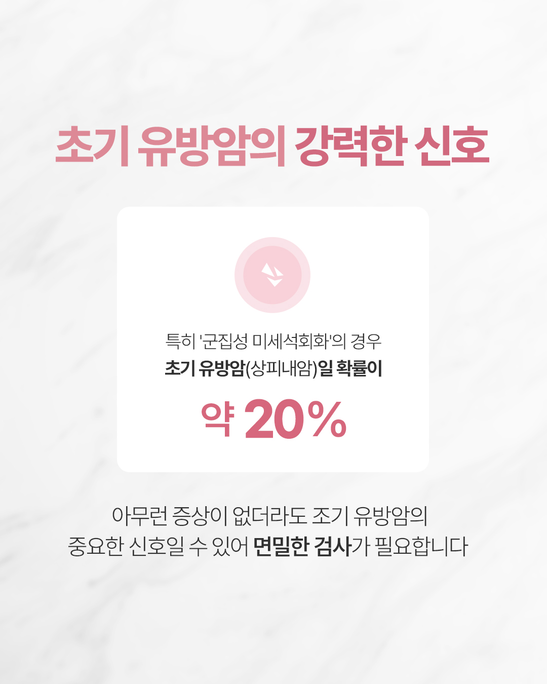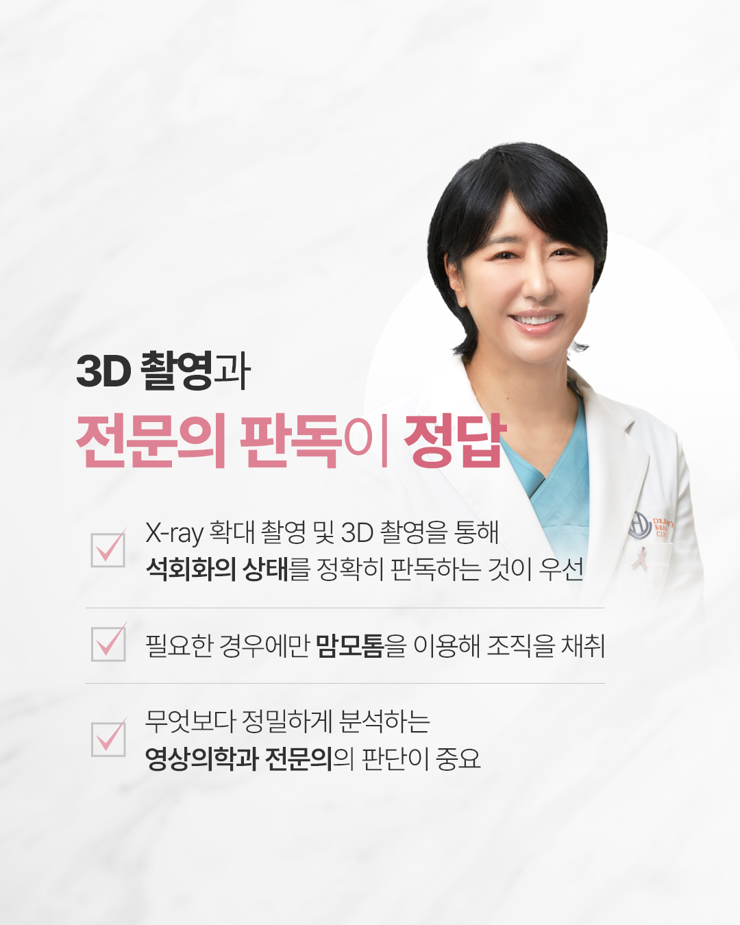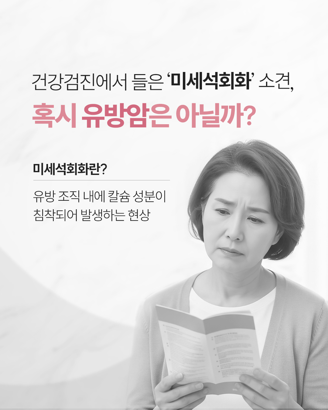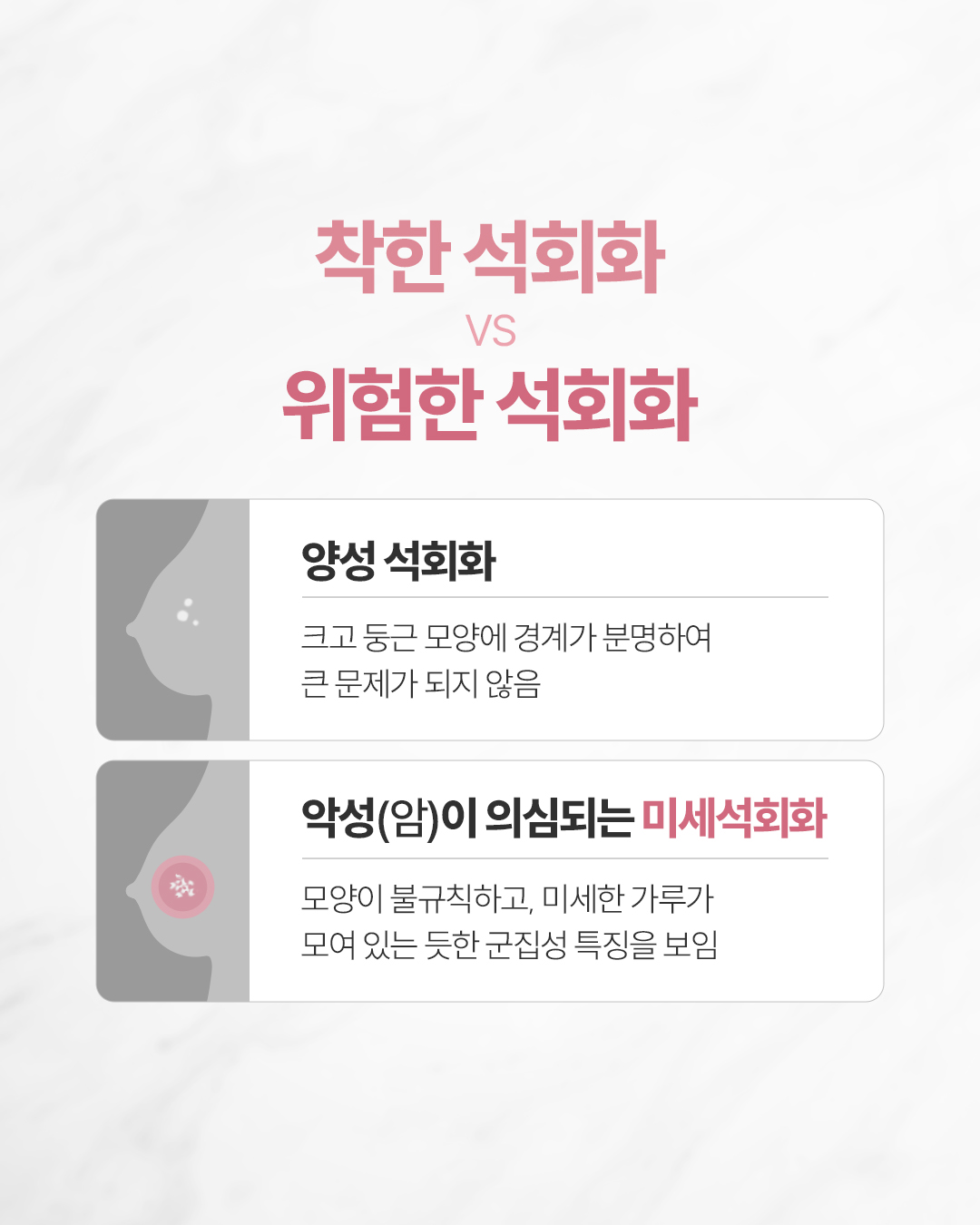 Q. 건강검진에서 들은 '미세석회화' 소견 혹시 유방암 아닐까요? 미세석회화는 유방 조직 내에 칼슘 성분이 침착되어 발생하는 현상입니다. 석회화는 착한 석회화와 위험한 석회화로 나뉠 수 있습니다. - 착한 석회화(양성 석회화): 크고 둥근 모양에 경계가 분명하여 큰 문제가 되지 않음 - 악성(암)이 의심되는 미세석회화(위험한 석회화): 모양이 불규칙하고, 미세한 가루가 모여 있는 듯한 군집성 특징을 보임 Q. 초기 유방암의 강력한 신호가 있을까요? '군집성 미세석회화'의 경우 초기 유방암(상피내암)일 확률이 약 20% 입니다. 따라서 아무런 증상이 없더라도 초기 유방암의 중요한 신호일 수 있어 면밀한 검사가 필요합니다. Q. 치밀유방이라면 더 주의해야 하는 이유는? 치밀유방은 유선조직이 하얗게 보여 일반 촬영술로는 석회화 진단이 어렵습니다. 디지털 3D 유방촬영을 통한 정밀 진단이 선행되어야 합니다. ![]() ![]() ![]() ![]() ![]() ![]() ![]() |