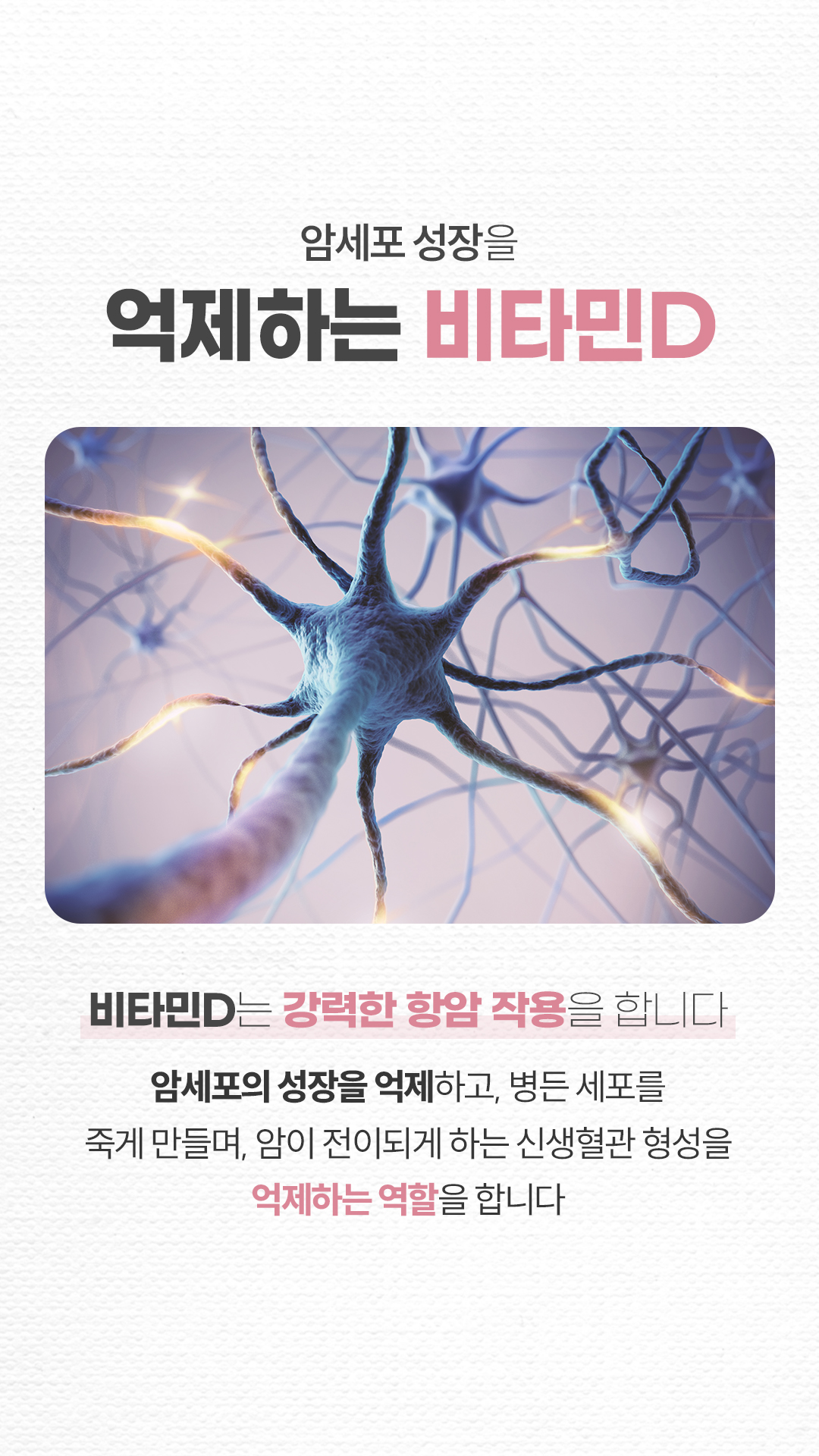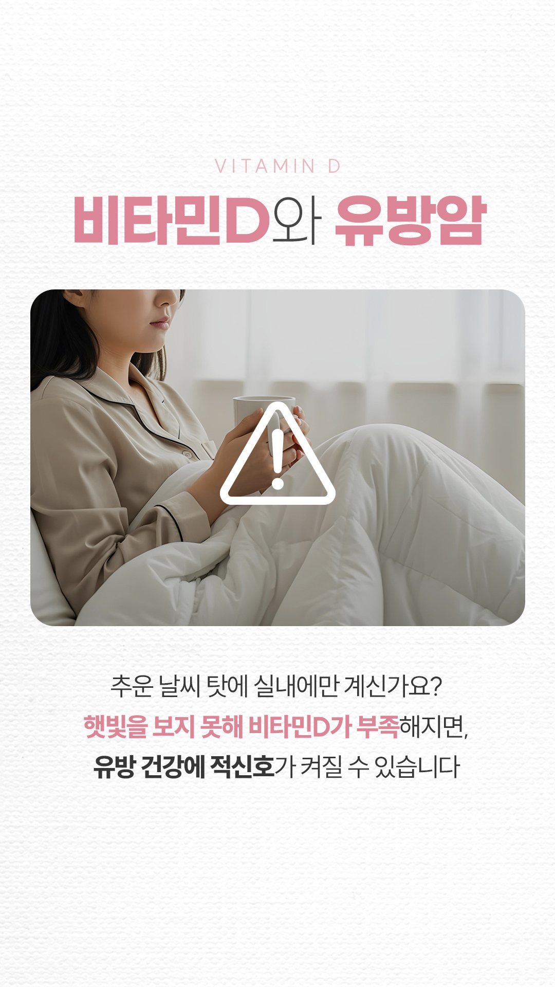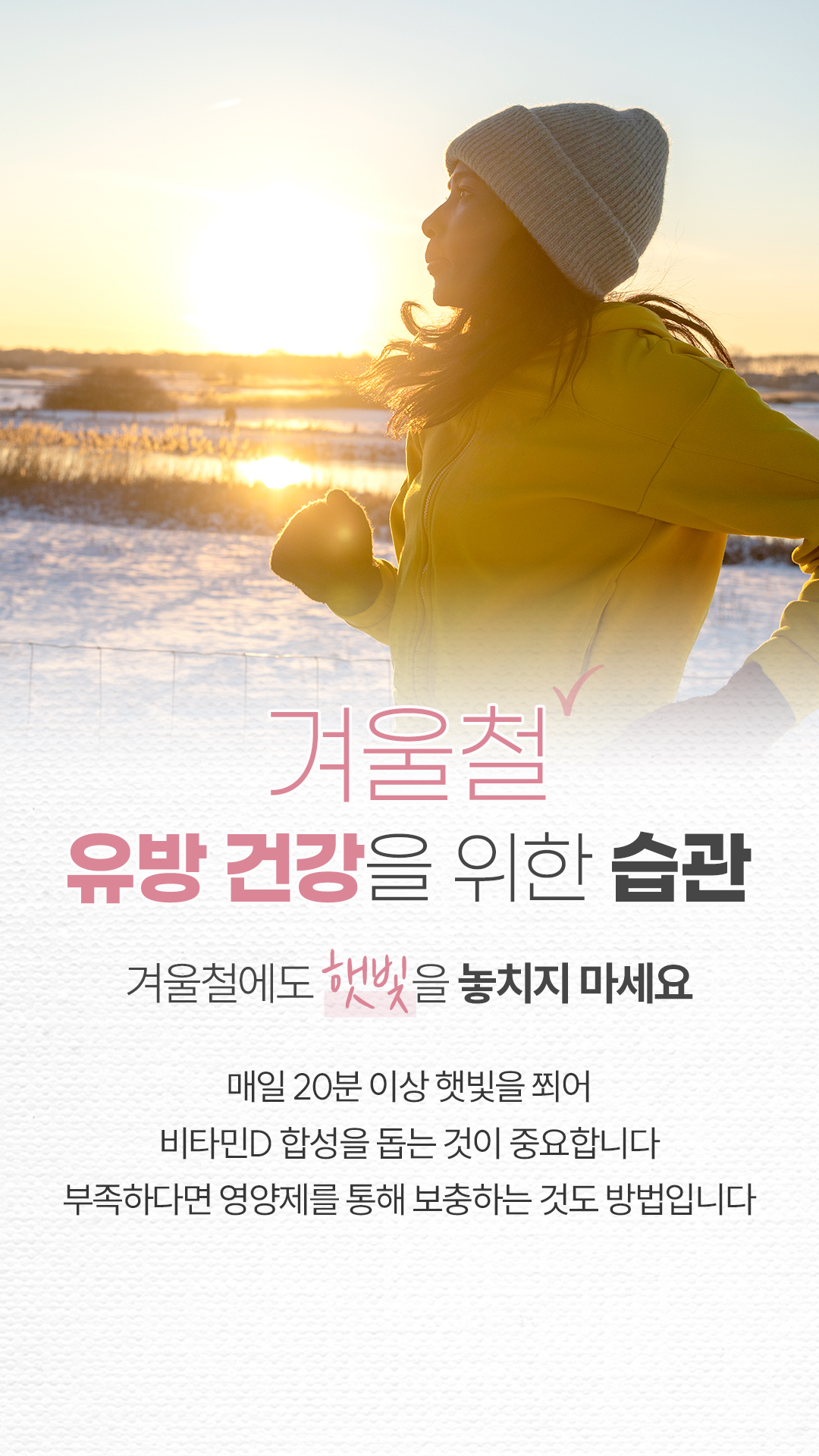 Q. 겨울철 실내생활 유방암을 조심해야 하는 이유는? 추운 날씨 때문에 실내에만 있는 계신가요? 햇빛을 보지 못해 비타민 D가 부족해지면, 유방 건강에 적신호가 켜질 수 있습니다. 비타민 D는 단순한 영양소가 아닙니다. 비타민 D가 충분할 경우 유방암으로 인한 사망 위험이 22% 감소한다는 연구결과가 있습니다. 즉, 비타민 D는 강력한 항암작용을 합니다. 암세포의 성장을 억제하고, 병든 세포를 죽게 만들며, 암이 전이되게 하는 신생혈관 형성을 억제하는 역할을 합니다. 따라서 겨울철에도 유방 건강을 지키기 위해서는 햇빛을 매일 20분 이상 쬐어 비타민 D 합성을 돕는 것이 중요합니다. 혹시 부족하다면 영양제를 통해 보충하는 것도 방법입니다. ![]() ![]() ![]() ![]() ![]() ![]() ![]() |