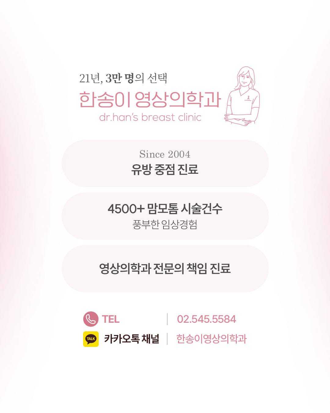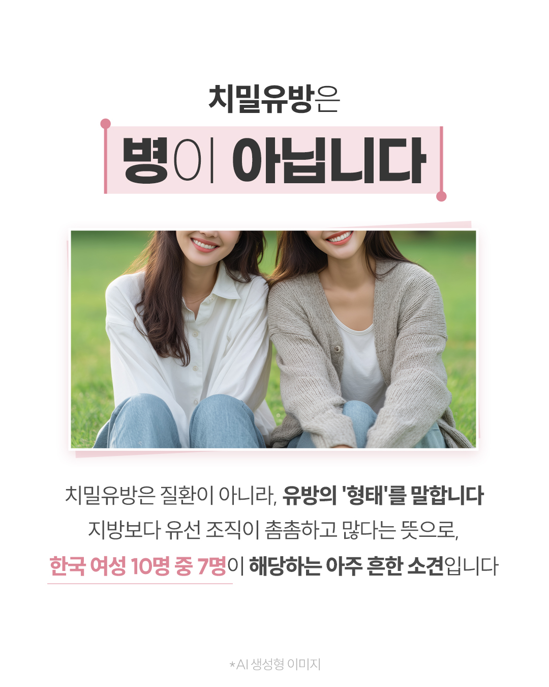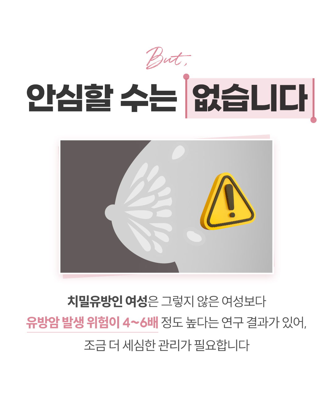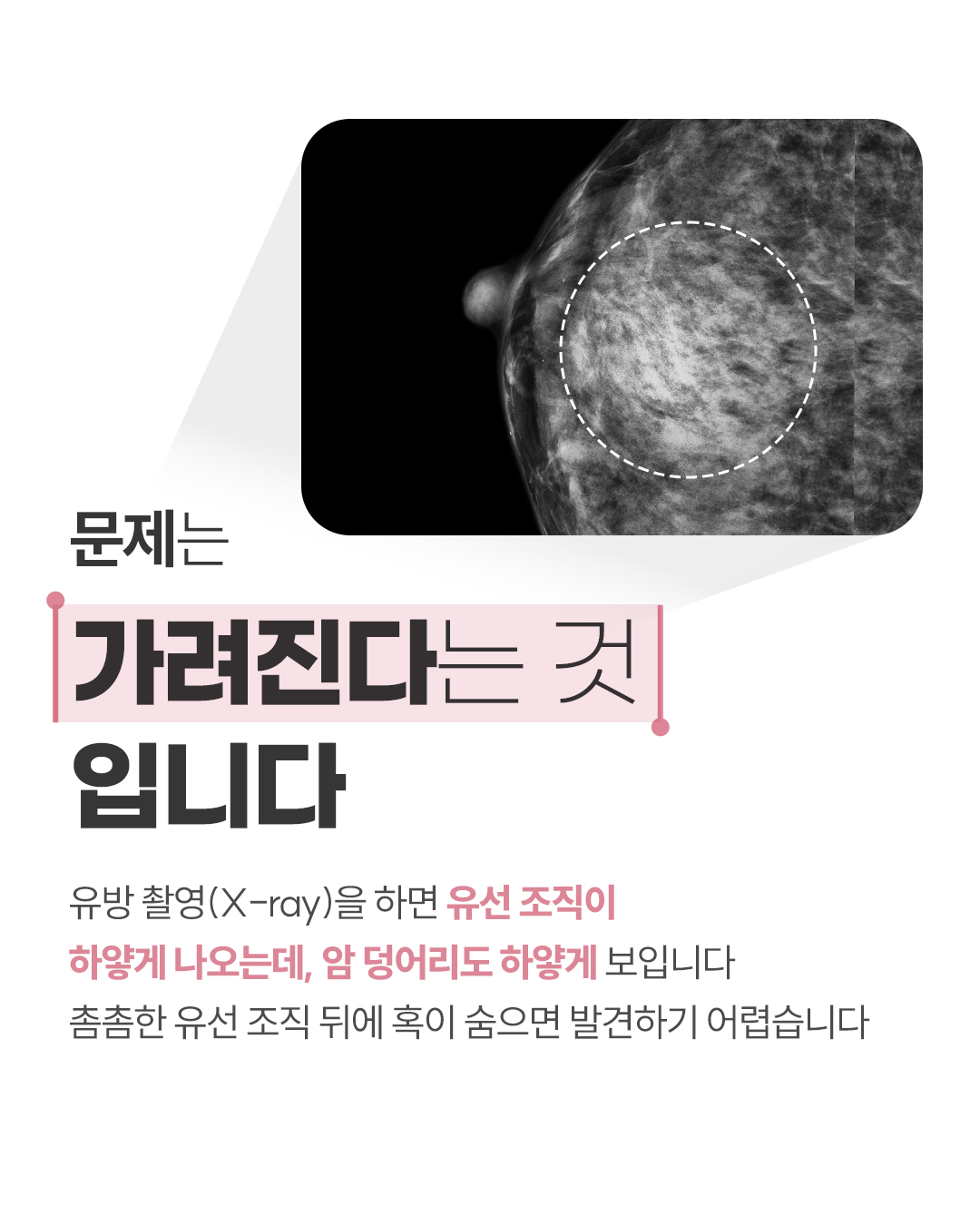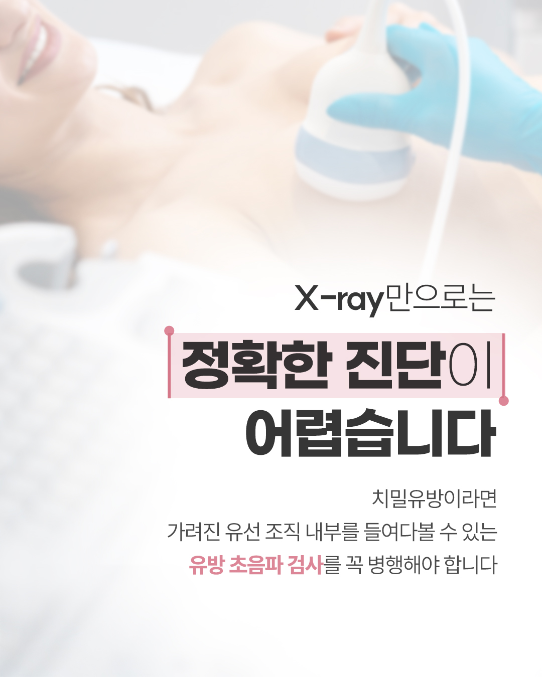 Q. 건강검진 결과표에 적힌 '치밀유방'이라는 글자, 혹시 유방에 문제가 생겼다는 뜻일까요? 치밀유방은 병이 아닙니다. 치밀유방은 질환이 아니라, 유방의 '형태'를 말합니다. 지방보다 유선조직이 촘촘하고 많다는 뜻으로, 한국 여성 10명 중 7명이 해당하는 아주 흔한 소견입니다. 하지만 안심할 수는 없습니다. 치밀유방인 여성은 그렇지 않은 여성보다 유방암 발생 위험이 4~6배 정도 높다는 연구 결과가 있어, 조금 더 세심한 관리가 필요합니다. Q. 치밀유방의 문제는 뭘가요? 문제는 가려진다는 것입니다. 유방촬영(X-ray)을 하면 유선 조직이 하얗게 나오는데, 암 덩어리도 하얗게 보입니다. 촘촘한 유선 조직 뒤에 혹이 숨으면 발견하기 어렵습니다. 즉, X-ray만으로는 정확한 진단이 어렵습니다. 치밀유방이라면 가려진 유선 조직 내부를 들여다볼 수 있는 유방 초음파 검사를 꼭 병행해야 합니다. ![]() ![]() ![]() ![]() ![]() ![]() ![]() |
