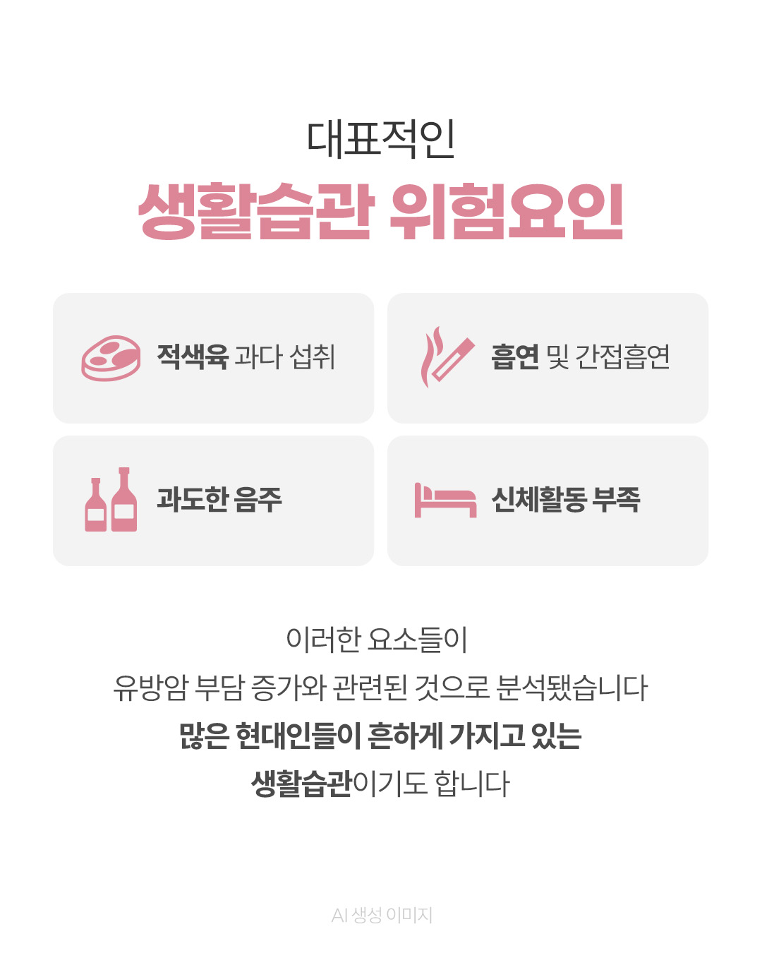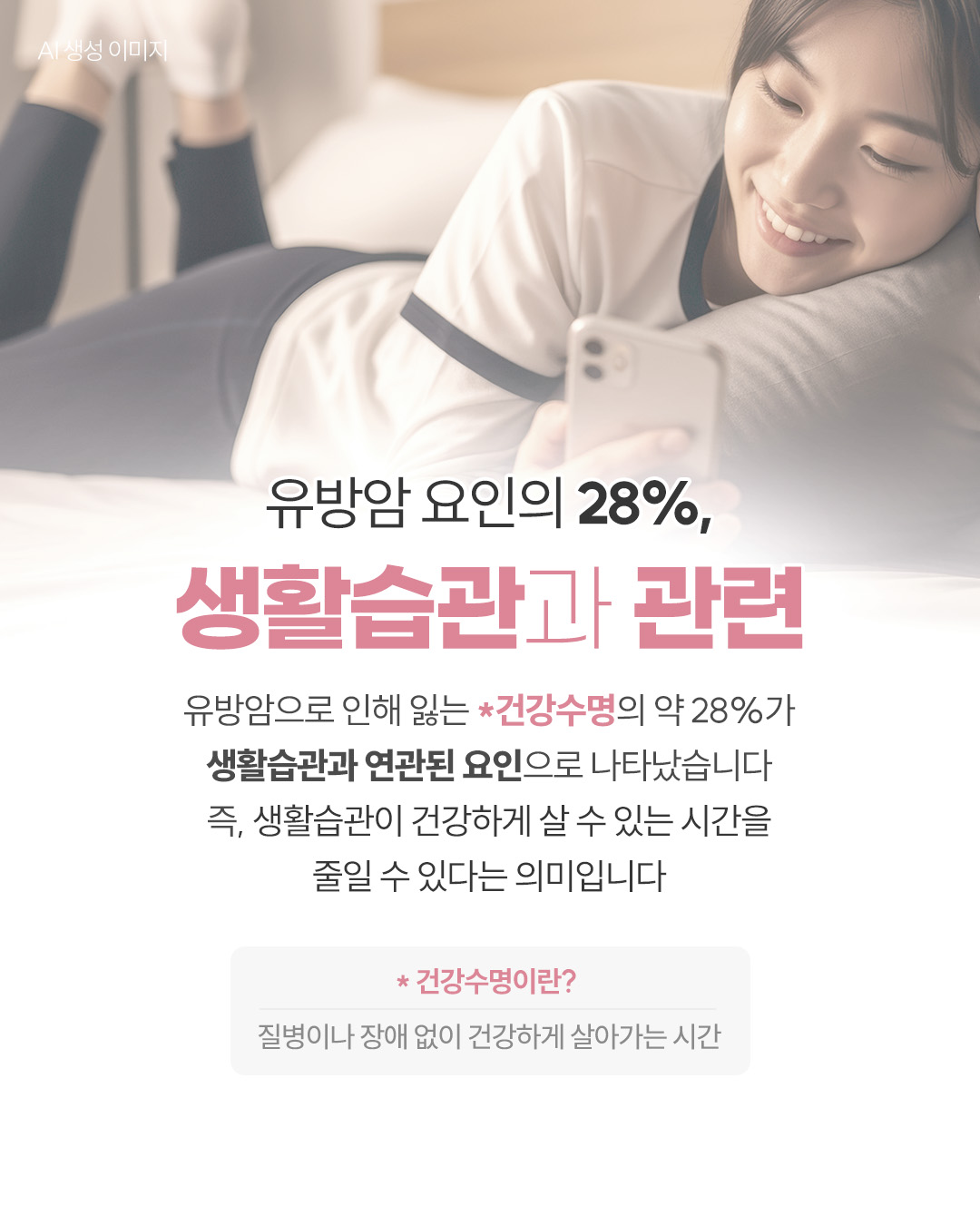 Q. 유방암과 관련된 생활습관이 있을까요? 유방암 요인의 28%는 생활습관과 관련이 있습니다. 즉, 유방암으로 인해 잃는 건강수명의 약 28% 생활습관과 연관된 요인으로 나타났습니다. 생활습관이 건강하게 살 수 있는 시간을 줄일 수 있다는 의미입니다. * 건강수명이란? 질병이나 장애 없이 건강하게 살아가는 시간 대표적인 위험 요인으로는 아래와 같은 것이 있습니다. - 적색육 과다 섭취 - 흡연 및 간접흡연 - 과도한 음주 - 신체활동 부족 이러한 요소들이 유방암 부담 증가와 관련된 것으로 분석됐습니다. 많은 현대인들이 흔하게 가지고 있는 생활습관이기도 합니다. ![]() ![]() ![]() ![]() ![]() ![]() ![]() |