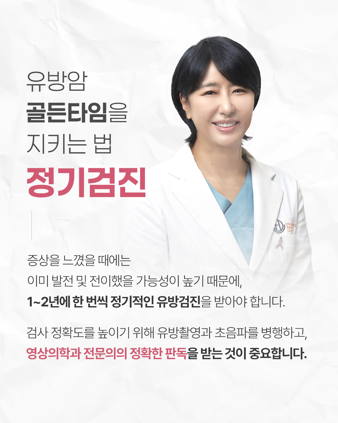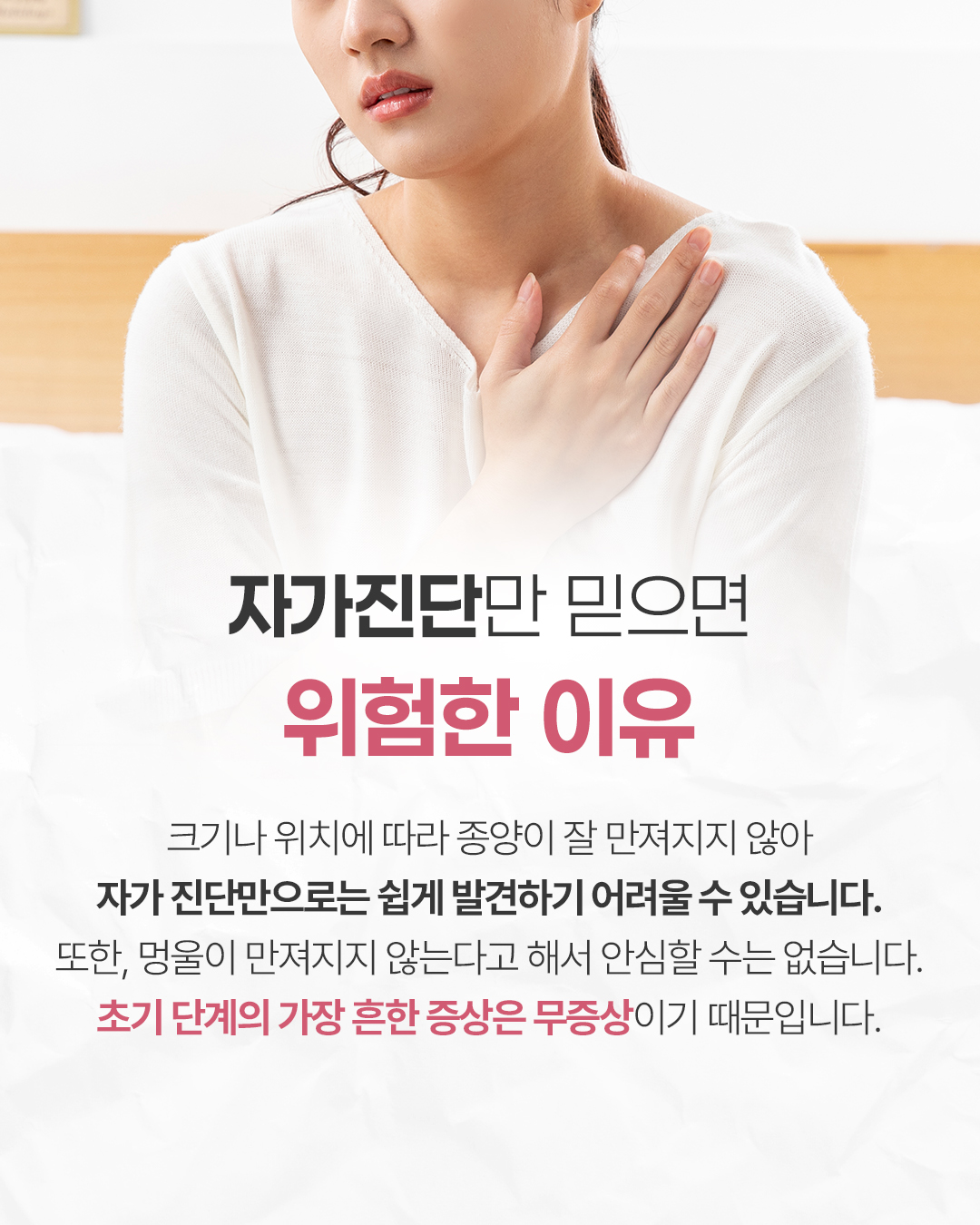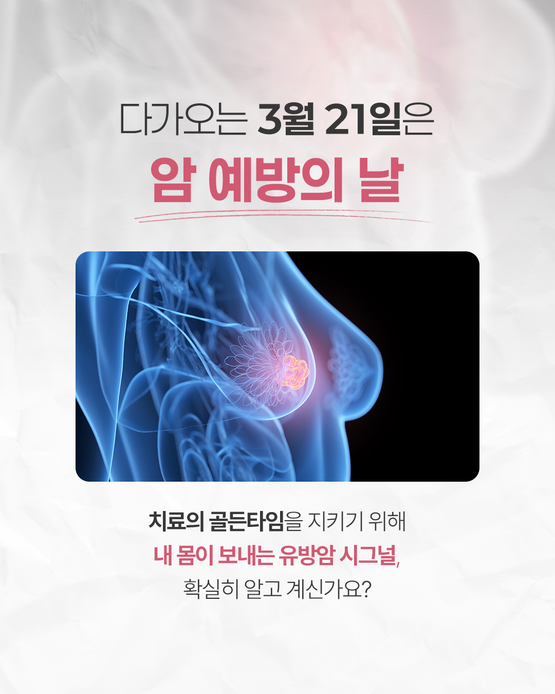 Q. 대표적인 유방암 시그널은 무엇일까요? 1. 통증이 없는 단단한 멍울 2. 오돌토돌한 피부 변형 3. 갑작스런 유두 함몰 유방암은 조기에 발견하여 치료할 경우 예후가 좋고, 0기 생존율이 98.3%로 매우 높습니다. 빨리 발견할수록 간단하게 치료가 가능하며 다른 조직으로의 전이를 막을 수 있습니다. Q. 자가진단만 믿으면 위험한 이유는? 크기나 위치에 따라 종양이 잘 만져지지 않아 자가 진단만으로는 쉽게 발견하기 어려울 수 있습니다. 또한, 멍울이 만져지지 않는다고 해서 안심할 수는 없습니다. 초기 단계의 가장 흔한 증상은 무증상이기 때문입니다. Q. 유방암의 골든타임을 지키는 법? 증상을 느꼈을 때에는 이미 발전 및 전이했을 가능성이 높기 때문에, 1~2년에 한 번씩 정기적인 유방검진을 받아야 합니다. 검사 정확도를 높이기 위해 유방촬영과 초음파를 병행하고, 영상의학과 전문의의 정확한 판독을 받는 것이 중요합니다. ![]() ![]() ![]() ![]() ![]() ![]() ![]() |