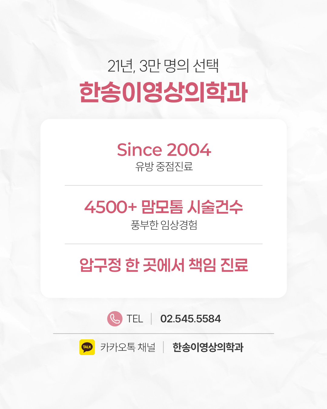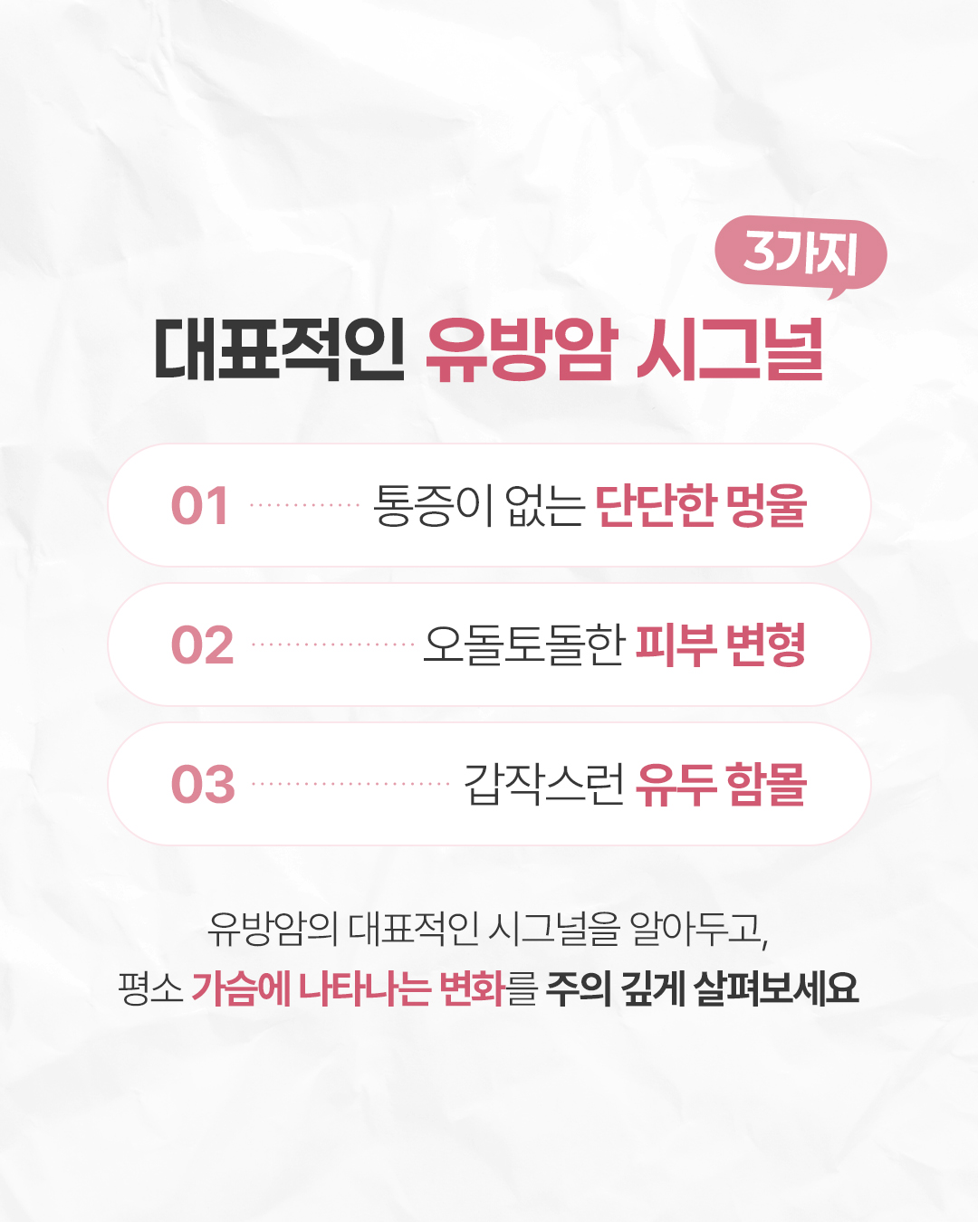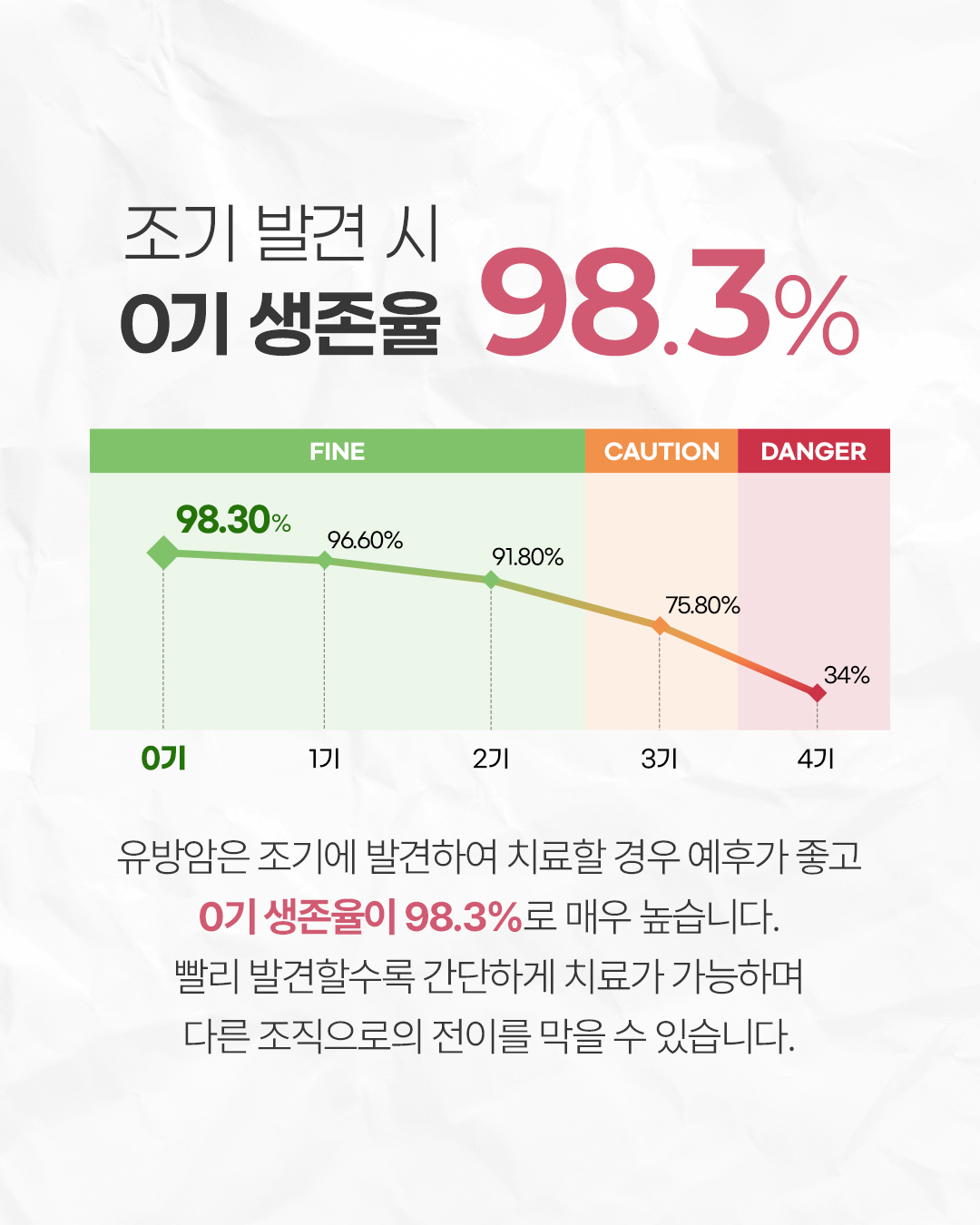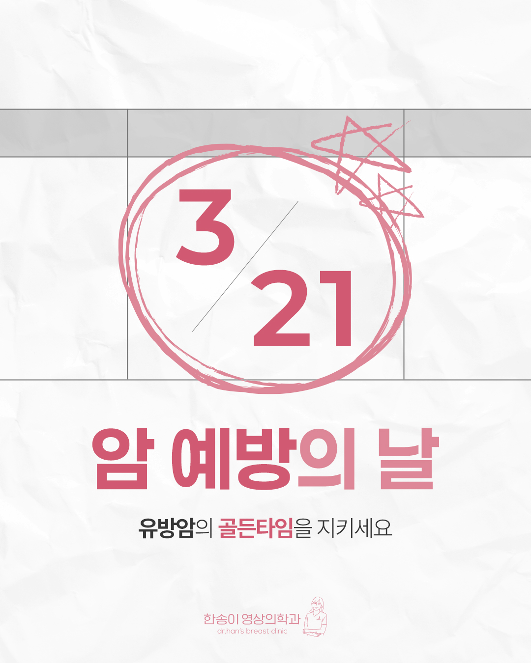 Q. 대표적인 유방암 시그널은 무엇일까요? 1. 통증이 없는 단단한 멍울 2. 오돌토돌한 피부 변형 3. 갑작스런 유두 함몰 유방암은 조기에 발견하여 치료할 경우 예후가 좋고, 0기 생존율이 98.3%로 매우 높습니다. 빨리 발견할수록 간단하게 치료가 가능하며 다른 조직으로의 전이를 막을 수 있습니다. Q. 자가진단만 믿으면 위험한 이유는? 크기나 위치에 따라 종양이 잘 만져지지 않아 자가 진단만으로는 쉽게 발견하기 어려울 수 있습니다. 또한, 멍울이 만져지지 않는다고 해서 안심할 수는 없습니다. 초기 단계의 가장 흔한 증상은 무증상이기 때문입니다. Q. 유방암의 골든타임을 지키는 법? 증상을 느꼈을 때에는 이미 발전 및 전이했을 가능성이 높기 때문에, 1~2년에 한 번씩 정기적인 유방검진을 받아야 합니다. 검사 정확도를 높이기 위해 유방촬영과 초음파를 병행하고, 영상의학과 전문의의 정확한 판독을 받는 것이 중요합니다. ![]() ![]() ![]() ![]() ![]() ![]() ![]() |