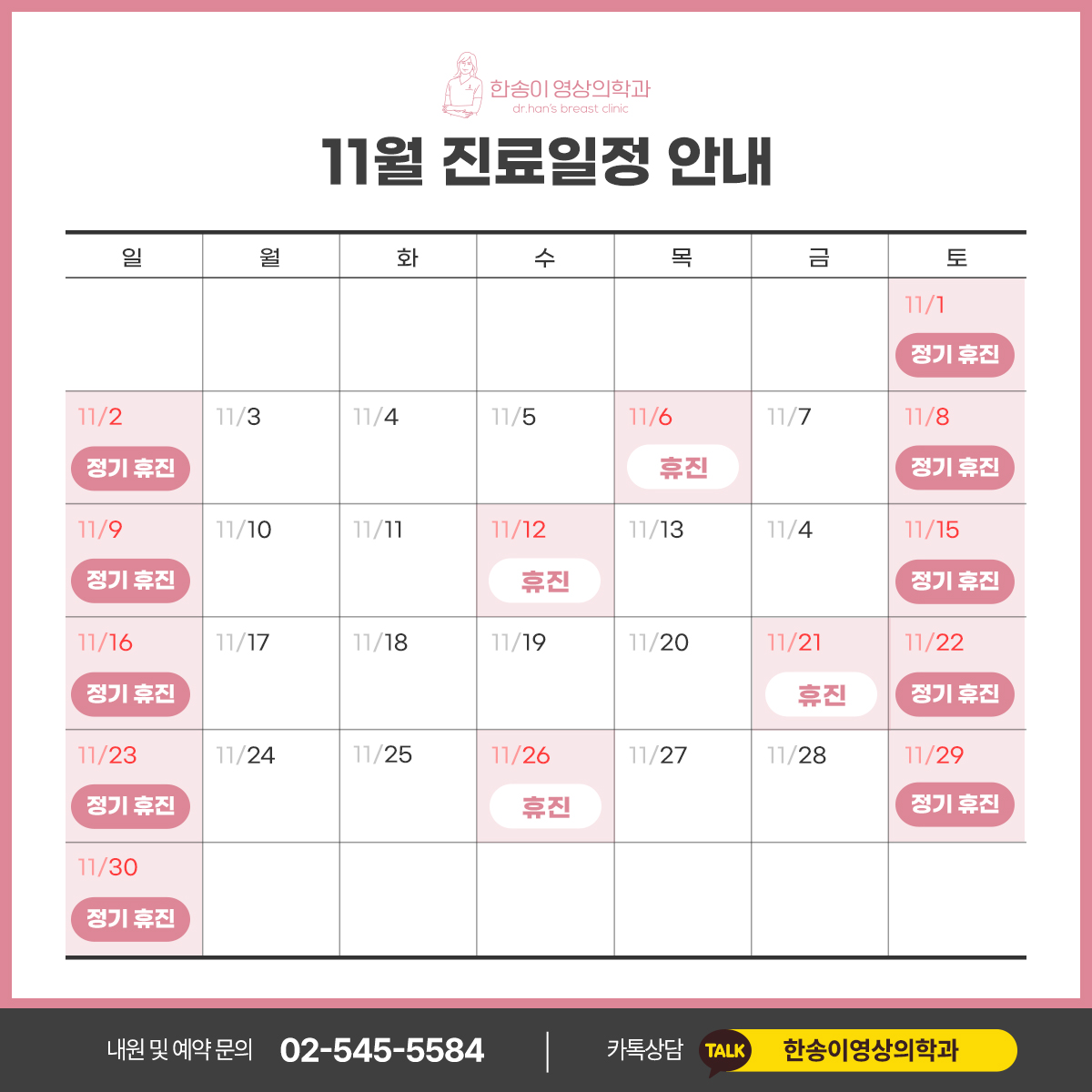 안녕하세요. 한송이영상의학과입니다. 본원의 11월 진료일정을 안내해 드립니다. ![]() <휴진> ◆ 11/6(목) 휴진 ◆ 11/12(수) 휴진 ◆ 11/21(금) 휴진 ◆ 11/26(수) 휴진 ◆ 매주 토요일, 일요일 정기휴진입니다. 내원예약 및 문의에 참고 부탁드립니다. |